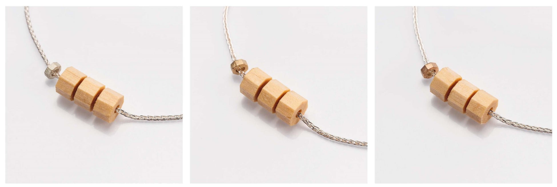 シルバーとゴールド、木曽桧、水晶と火地水、自然の3大エレメントを網羅したブレスレット。縁起のいい八角形の小さな木曽桧ビーズを3つ並べて。経年劣化した際にはビーズ交換できるという、サステナブルな「常若」の思想を感じさせるデザイン。