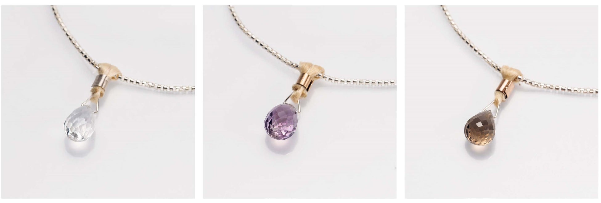 過酷な自然環境にも柔軟に形を変え、生き抜く水の雫をイメージし、水晶、アメシスト、スモーキークオーツをペアシェイプに仕上げたシルバーブレスレット。表面にはドロップカットを施し、輝きに多面性を加えて。ヘッド部分には本麻苧をさりげなく配し、浄化への期待を高めています。