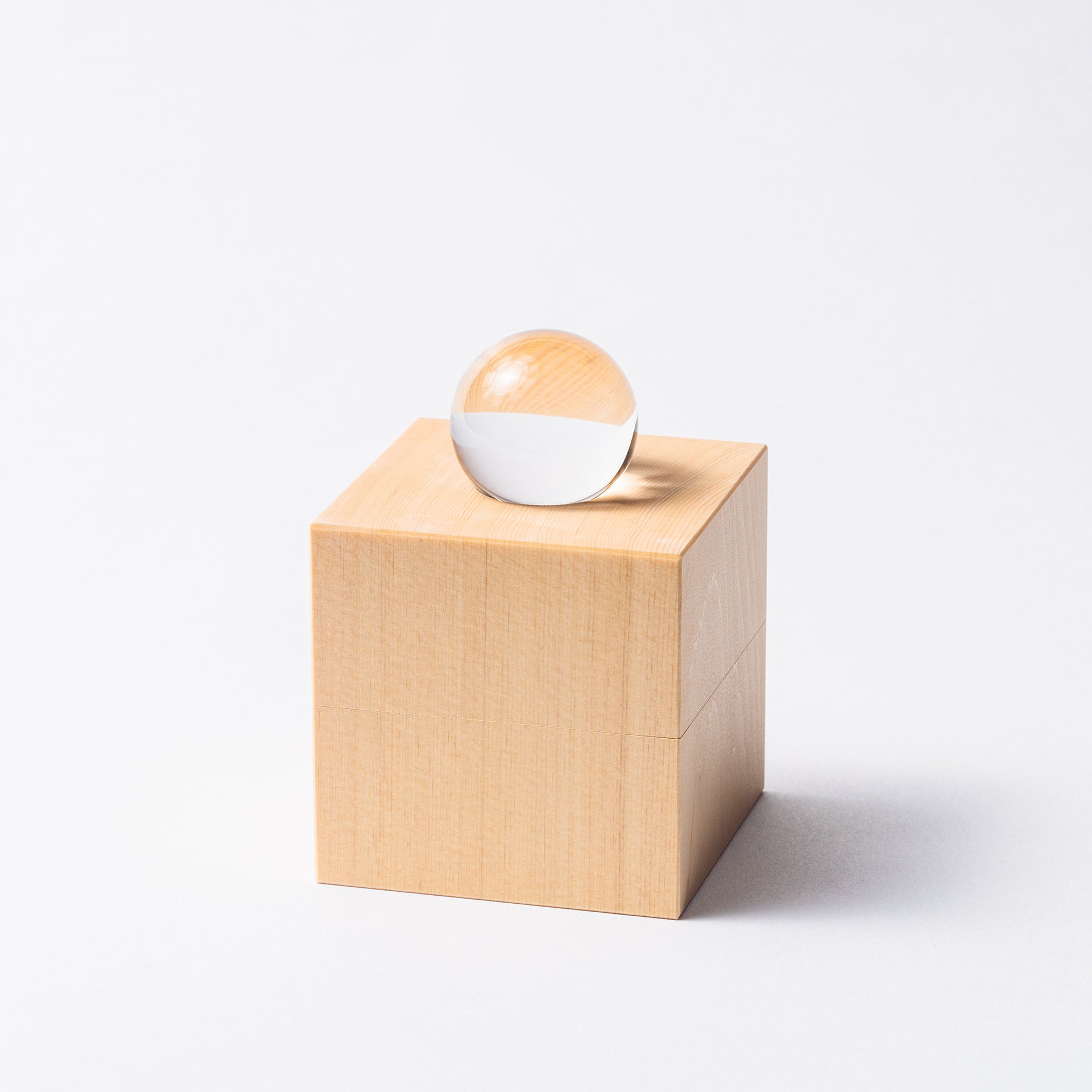 透明度の高さを厳選したグレードの高い水晶玉は、純粋と浄化を象徴し、御神宝としても使用されています。そのスフィアをスクエアな木曽桧の台にセット。台座の裏面にも窪みをつくり、飾りやすさにも配慮。