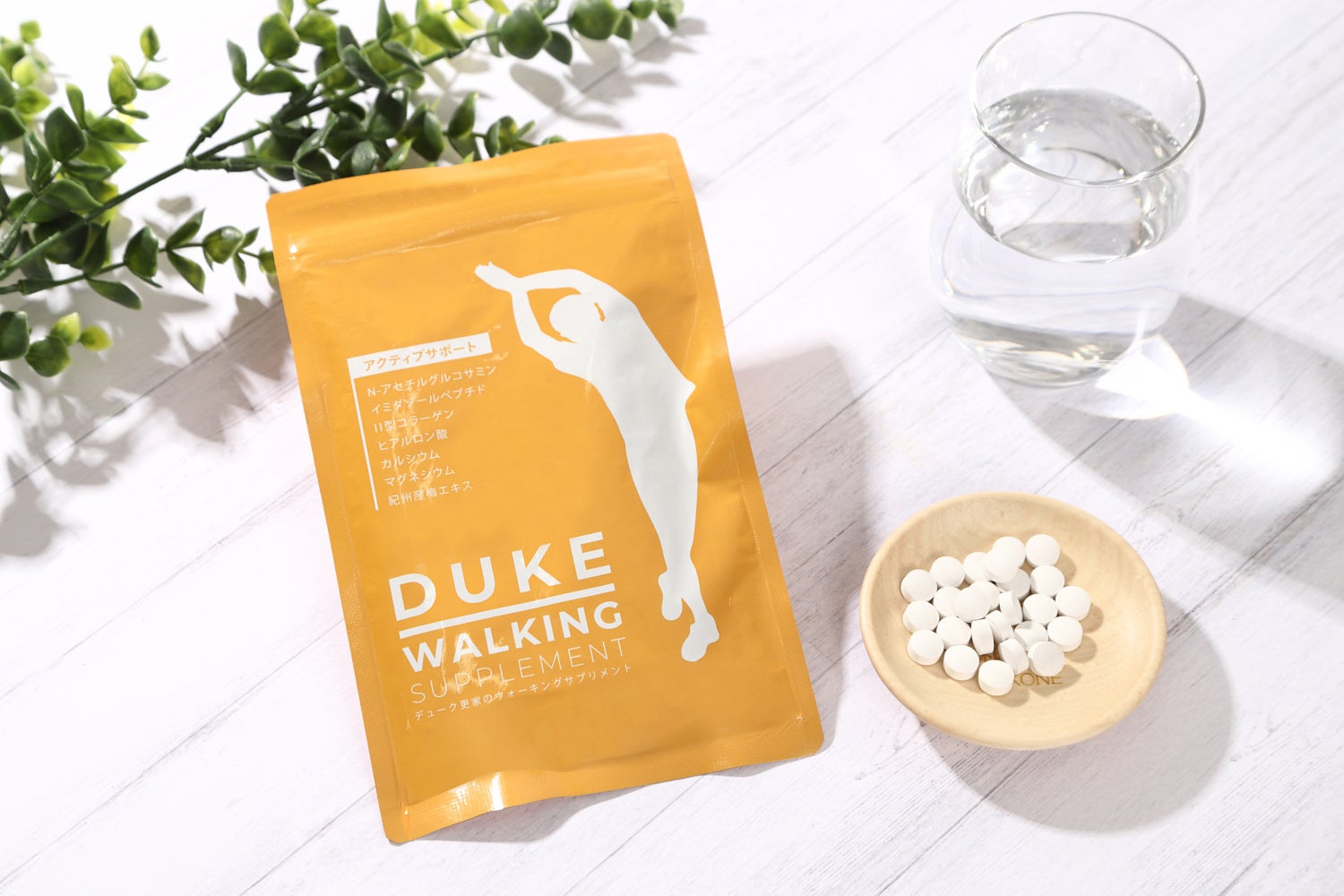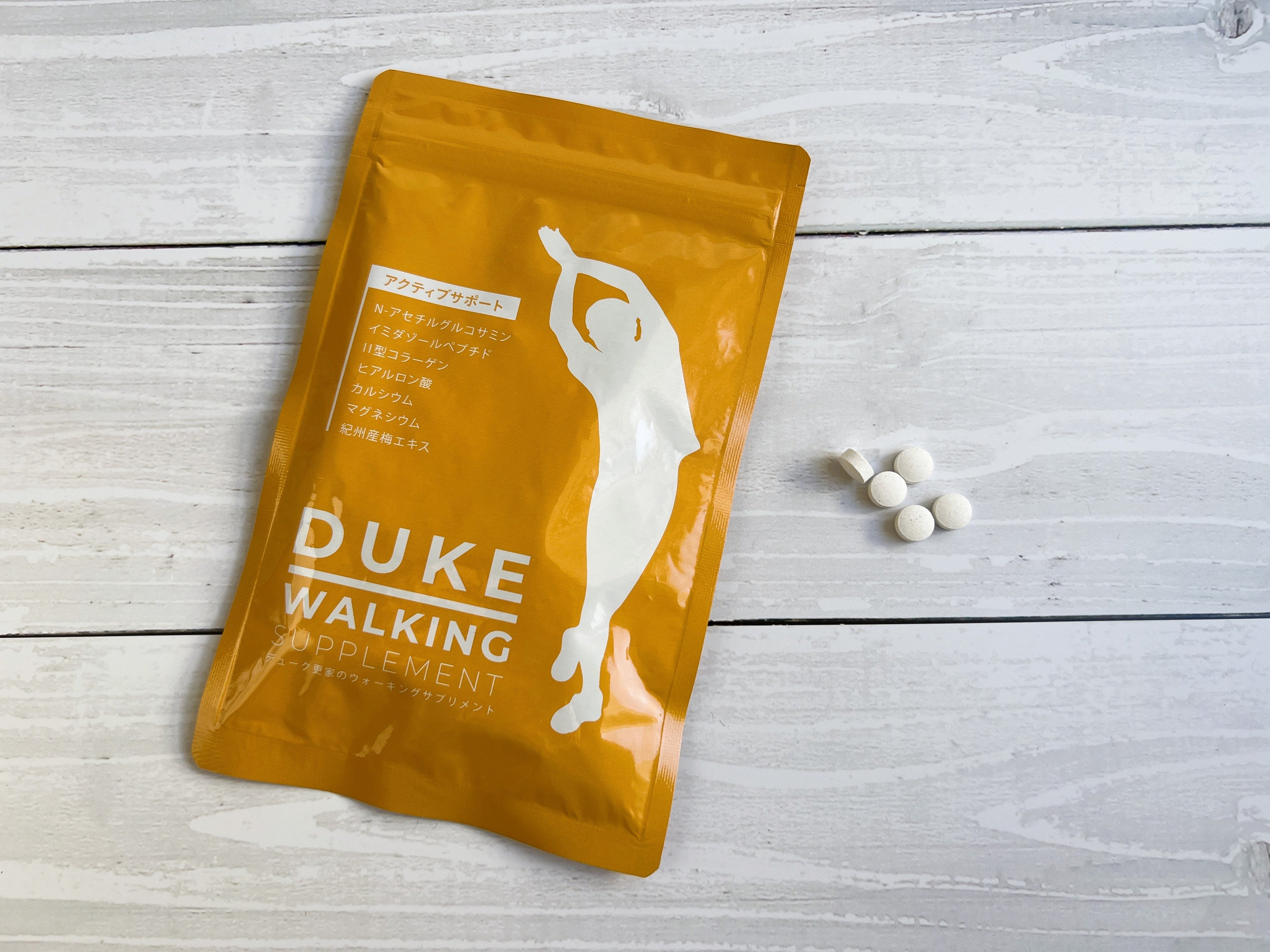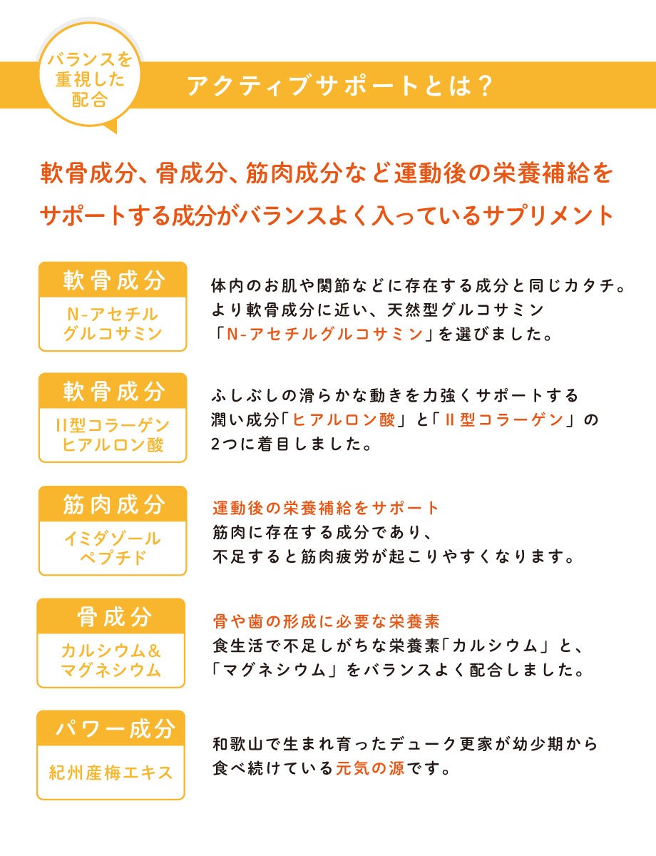 「アクティブサポート」は軟骨成分、骨成分、運動後の栄養補給をサポートする成分がバランスよく入っているサプリメントです。肌や関節などに存在する成分と同じ形でより軟骨成分に近い、天然型グルコサミン「N‐アセチルグルコサミン」のほか、関節のなめらかな動きをサポートする「ヒアルロン酸」、運動後の栄養補給をサポートする成分として「イミダゾールペプチド」、骨や歯の形成に必要な栄養素「カルシウム」「マグネシウム」を配合。また、デューク更家の出身地である和歌山県「紀州産梅エキス」も配合しています。
