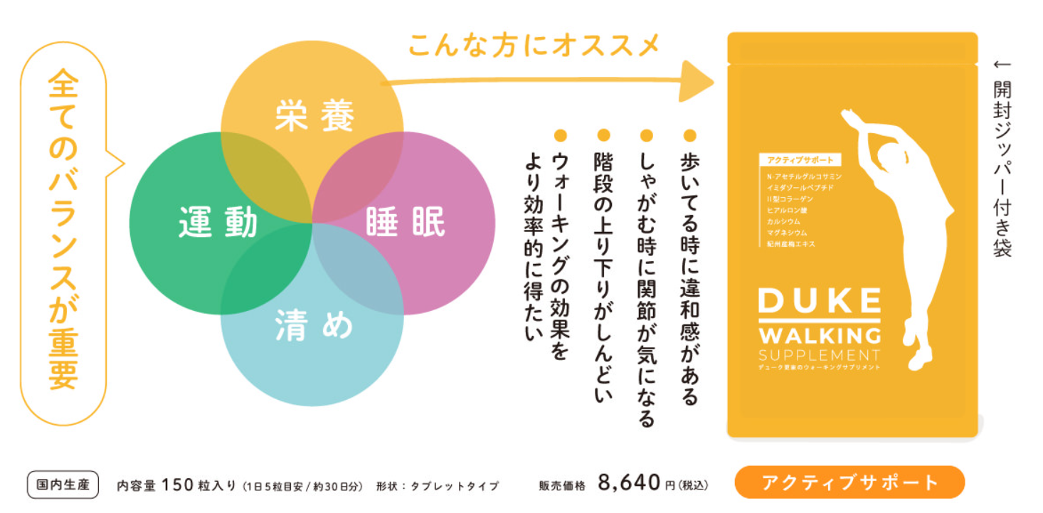 飲むウォーキングケア 「アクティブサポート」は、デューク更家監修のもと、運動と栄養をデザインするサプリメントです。
