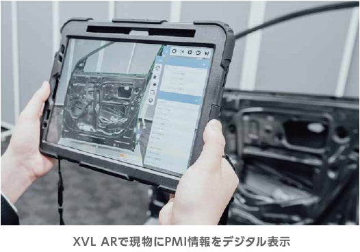 今回、「XVL VR」の展示では、来場者の手の動きを仮想空間の手の動きに連動させて、あたかもその場で作業をしているような感覚を体験できます。「XVL AR」の展示では、自動車のドアパネルにタブレット端末のカメラをかざすだけで、そこに映る部品のさまざまなデータが表示され、また、組み立て作業のプロセスをアニメーションで確認できるなど、ものづくり現場での有用性を確かめることができます。