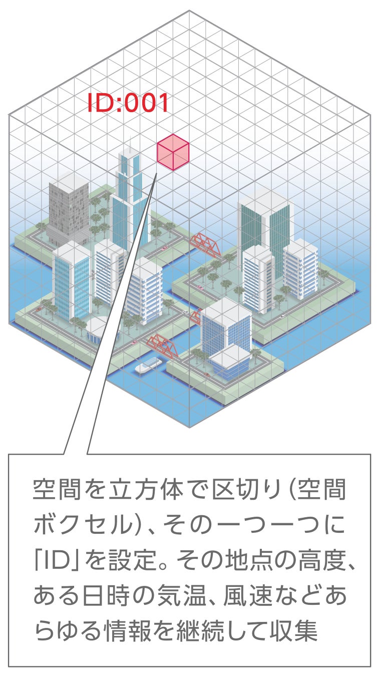 世界に先駆けて「空間」のデータ連携を図っていこうとする取組が、「3次元空間情報基盤」の整備です。具体的には、空間を立方体で区切り(空間ボクセル)、その一つ一つに「ID」を設定し、各IDに地物、気象、人流をはじめとしたさまざまな情報を紐付けます。さらに、これらのデータをもとにデジタル上の空間(デジタルツイン)を形成し、この上でのデータ連携により、安全・安心なドローンの自律運行、インフラ管理の高度化・効率化などを実現します。