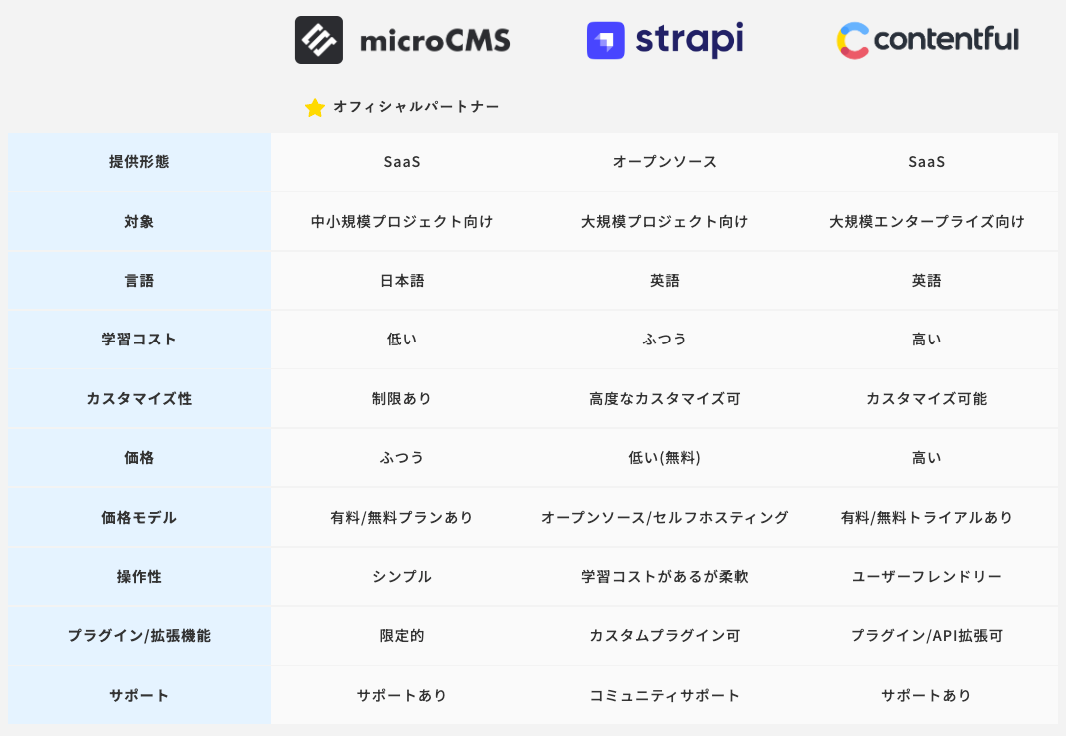 弊社は、microCMSのオフィシャルパートナーとして、またstrapi、contentfulといった多数のヘッドレスCMSに対応しています。