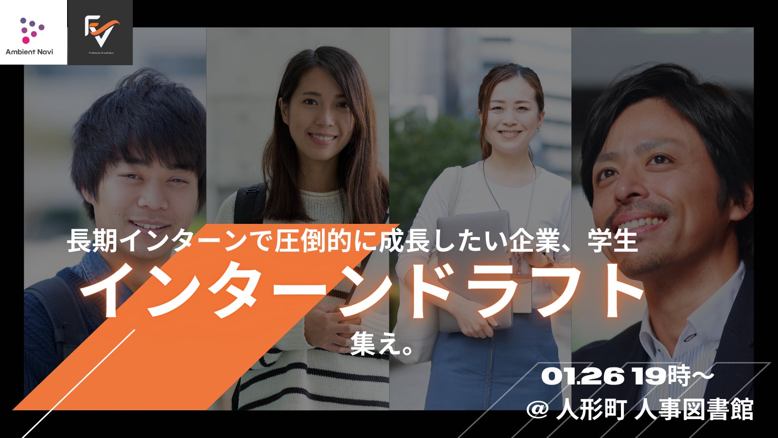 「可能性を見つけ、可能性を開放する」をミッションにZ世代採用ブランディング、RPO事業を行うFindValue(株)(福島県郡山市、代表取締役 宗近翼)と、採用特化型SNS運用、長期インターン紹介事業を行う(株)アンビエントナビ(東京都品川区 代表取締役 夏目莞士)が共催で「長期インターンドラフト」を開催します。(2024年1月26日(金) 18:30開場 19時イベント開始 於:人形町 人事図書館 東京都中央区日本橋蛎殻町1-12-7 Wacross Ningyocho 6F)
