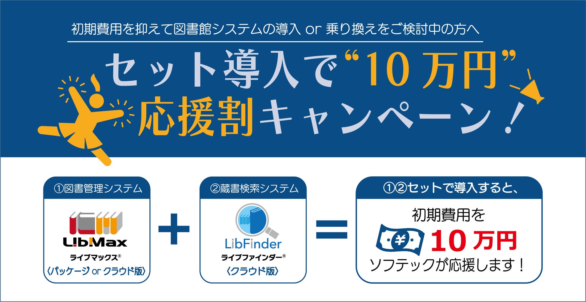 ①図書管理システム+②蔵書検索システムをセットで導入すると、初期費用合計より『10万円』をソフテックが負担いたします。図書館システムの新規導入 or 乗り換えをご検討中の学校を応援します!