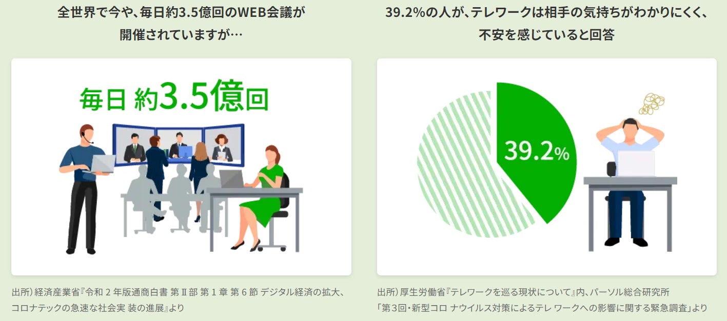 ■ WEB会議は大きな利便性をもたらしている反面、厚生労働省の調査資料*によれば「非対面のやりとりは相手の気持ちがわかりにくく不安」という方は39.2%、内閣府の調査**によれば「画⾯を通じた情報のみによるコミュニケーション不⾜やストレス」という方は27.1%であり、少なくない方がWEB上でのコミュニケーションに難しさを抱えていることがわかります。