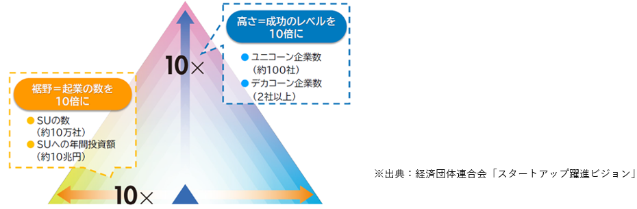 国のスタートアップ支援は、2019年の「世界に伍するスタートアップ・エコシステム拠点形成戦略」発表からはじまり、2022年11月には、岸田文雄首相が掲げる経済政策「新しい資本主義」の取り組みとして、内閣府より日本のスタートアップを大幅に増やすための戦略とロードマップである、「スタートアップ育成5か年計画」が打ち出されました。スタートアップは「社会的課題を成長のエンジンに転換して、持続可能な経済社会を実現する、 『新しい資本主義』の考え方を体現する企業」とされています。また、具体的な目標として、5年後の2027年にスタートアップへの投資額を現在の8,000億円規模から、10倍の10兆円規模に拡大すること、ユニコーン企業数を100社創出し、スタートアップを10万社創出するという目標が掲げられ、また、2022年度補正予算でスタートアップ関連施策過去最高の約1兆円が計上されるなど、戦後の創業期に次ぐ、「第二の創業ブーム」を実現すべく取り組みが進められています。