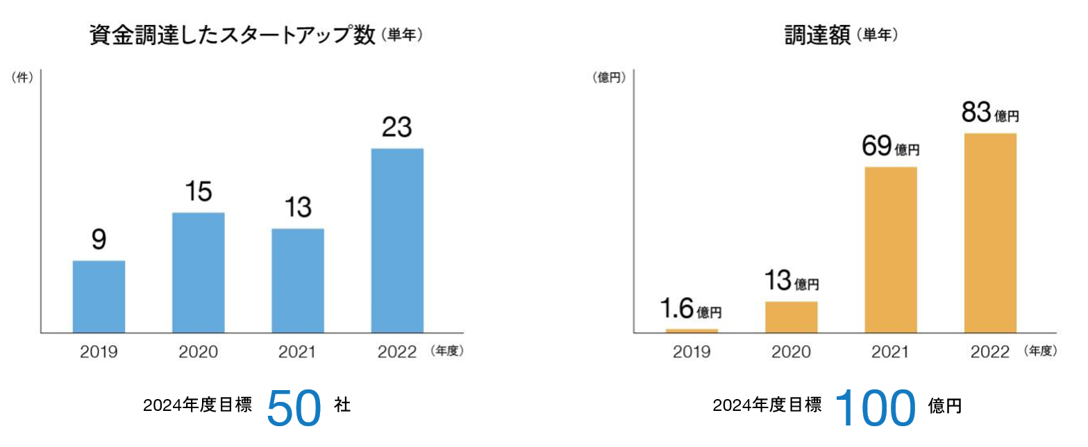 また、このような政府の流れに合わせるように、北海道においても政府の取り組み開始と同時期の2019年より「STARTUP CITY SAPPOROプロジェクト」が始動し、翌2020年には内閣府より全国で8地域が選ばれた「スタートアップ・エコシステム推進都市」に札幌市・北海道が選定されました。その後も、インキュベーション施設「SAPPORO Incubation Hub DRIVE」が札幌市内で開設、官民連携地域ファンド「札幌イノベーションファンド」の組成、2023年には北海道に「スタートアップ推進室」が新設されるなど、札幌市・北海道でのスタートアップ支援は年々盛り上がりを見せてきました。大学や民間でも支援取り組みが拡がっており、その結果、北海道内のスタートアップ数は現在100社以上となり、農業や宇宙・AI等の分野のスタートアップ成長による資金調達額は2019年度1.6億円から2022度83億円へと4年で大幅に拡大しています。