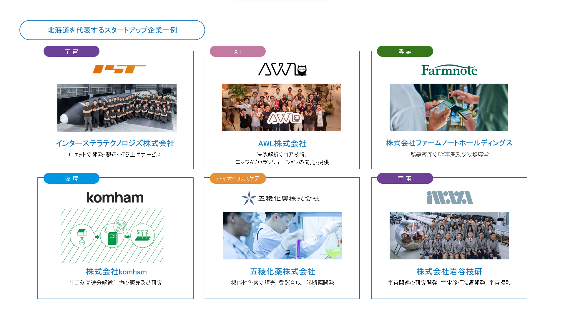 もともとの強みである、IT・AI領域を基盤としつつも、北海道らしいスタートアップ戦略として、「市場規模・将来性、北海道の強み、北海道の実績・機会」の3項目を評価基準とし、以下の3つの産業分野に注力していくことといたします。農業産出額、漁業産出額全国1位、世界有数の地の利を活かした宇宙港「北海道スペースポート」の存在、再エネのポテンシャル(太陽光、風力他)など、北海道というフィールドを存分に活かし、グローバルに成長するスタートアップを生みだしていきます。