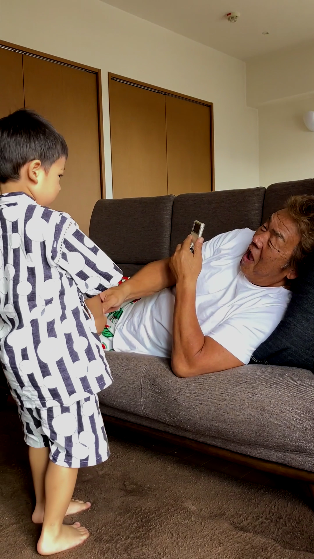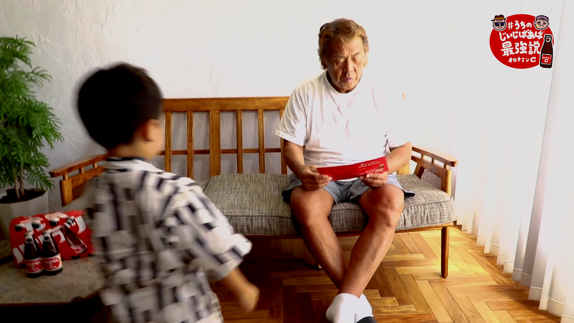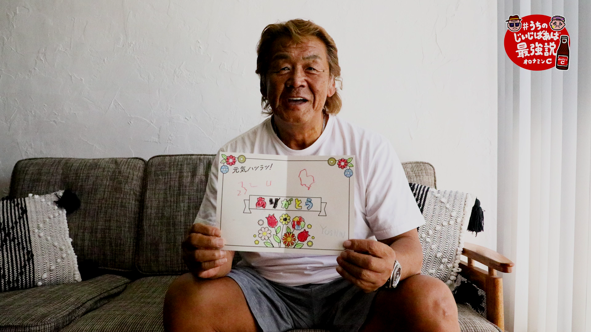 スマホを手にソファに寝転ぶ最強じいじ長州力さんの様子を見ていた由真くんが、「じいじ、何してるの?」と一言。笑顔になる長州さんに「じいじ、いつもありがとう」と日頃の感謝を込めて、オロナミンCを手渡す。「知ってるか、由真!オロナミンCは黄色いんだ!これはビタミンB2本来の色だぞぉ!」と話し、長州さんはオロナミンCを飲む。由真くんの「元気ハツラツ?」というかけ声に、「いいね!オロナミンC」と元気いっぱいの長州力さん。