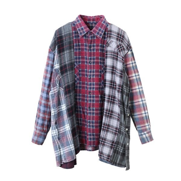 5種類の柄が違うチェックシャツを再利用して、両脇にはフロントボタンパーツを取り入れた