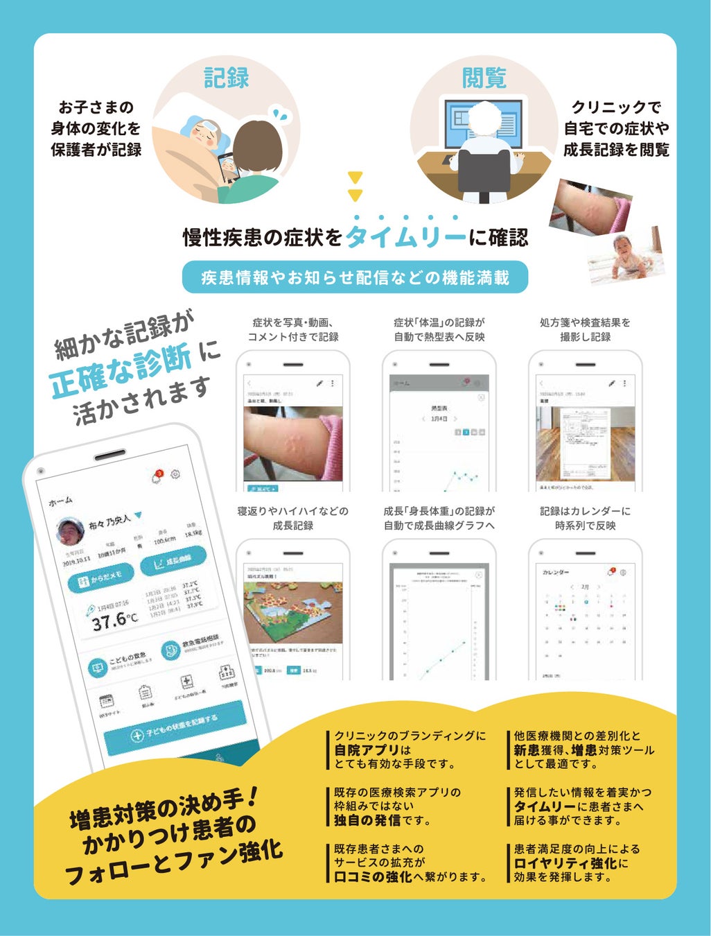 小児科クリニックのオリジナルアプリとして、子どもの体調の変化や症状を記録し、かかりつけクリニックの医師との情報共有出来るアプリとして、2019年にリリース。