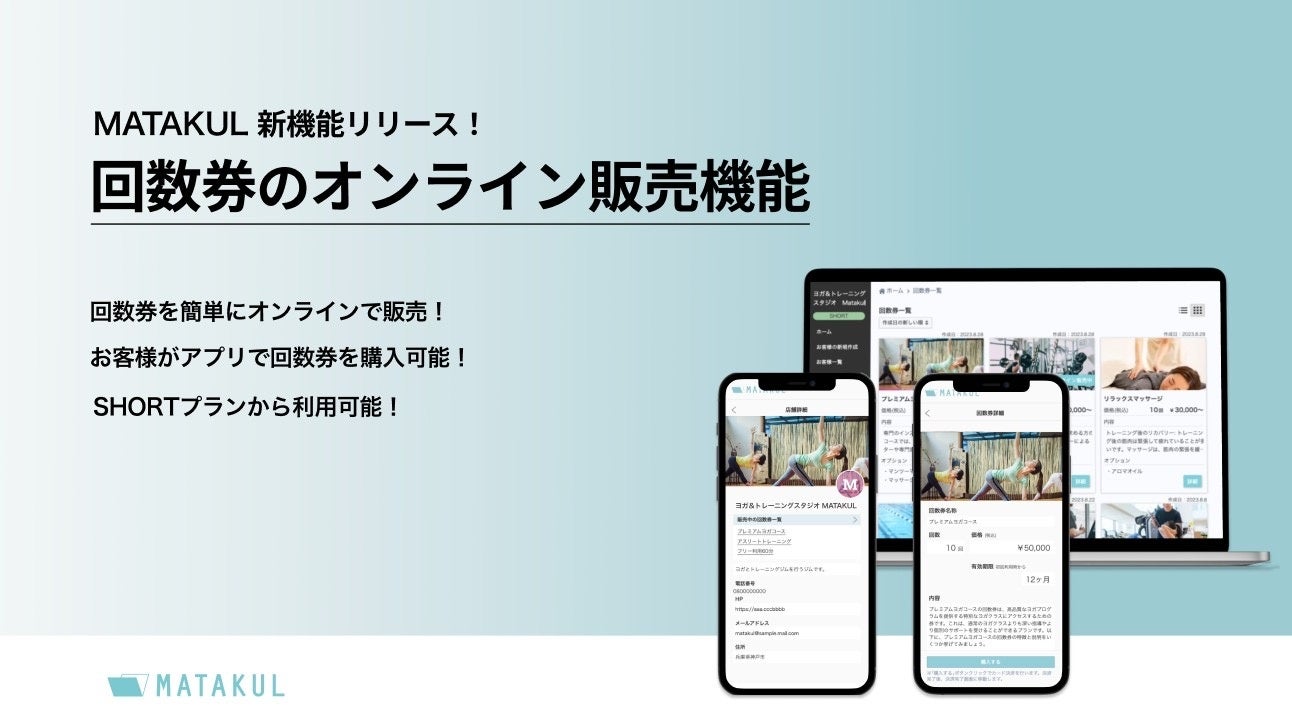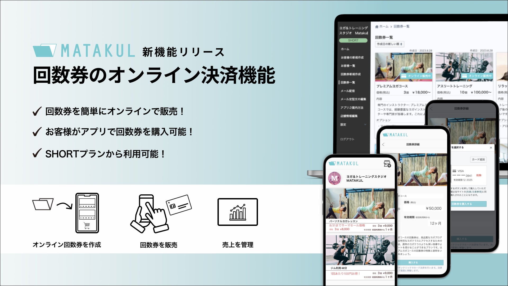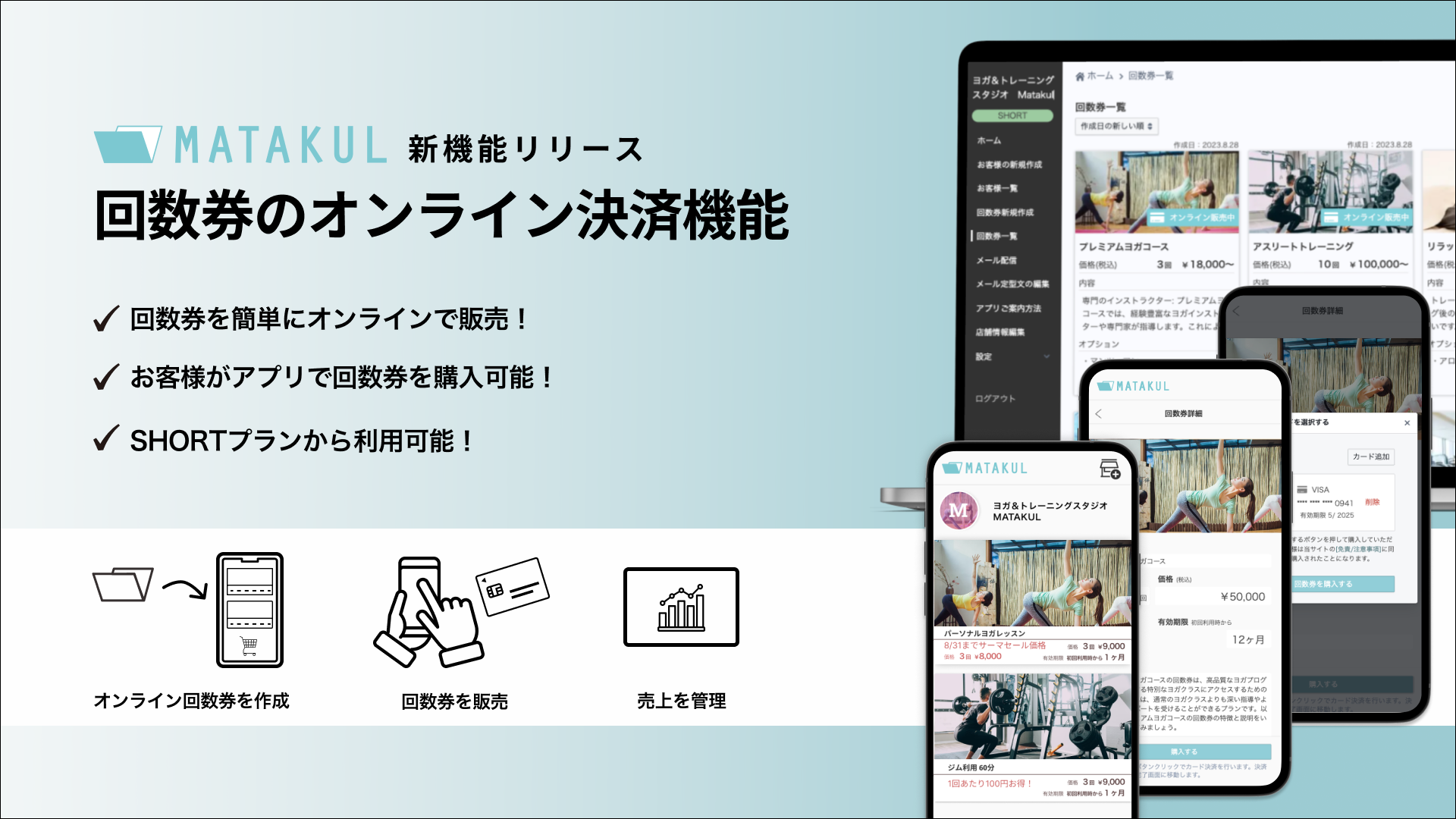 MATAKULは、新たに決済機能を導入いたしました。これまでは店舗にて回数券の発行・支払いを行っていただいていましたが、オンライン決済機能の導入によりどこからでも回数券を販売し購入していただくことができます。