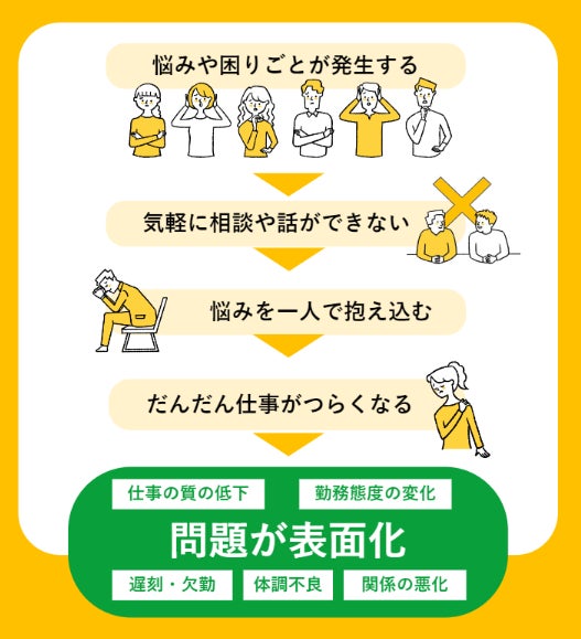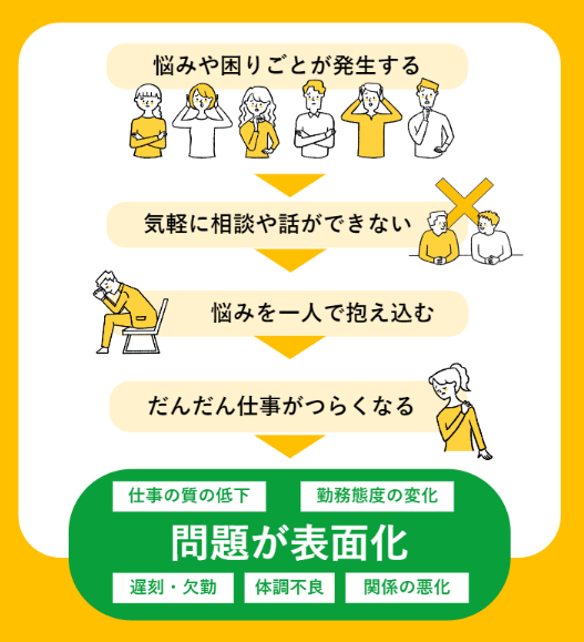 こういった環境下においては、人的余裕と時間的余裕がなくなることによって「焦り」や「不安」が誘発され、現場従業員は悩みや困りごとを抱えやすくなります。離職や休職等のトラブルは、このような不安の種が解決されずに蓄積されることで生じるといわれているのです。