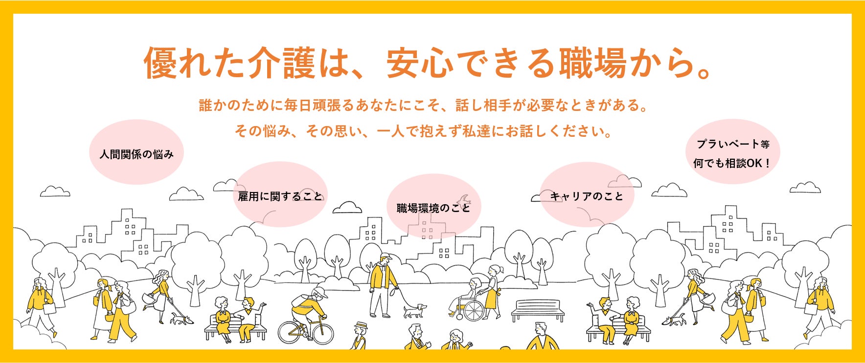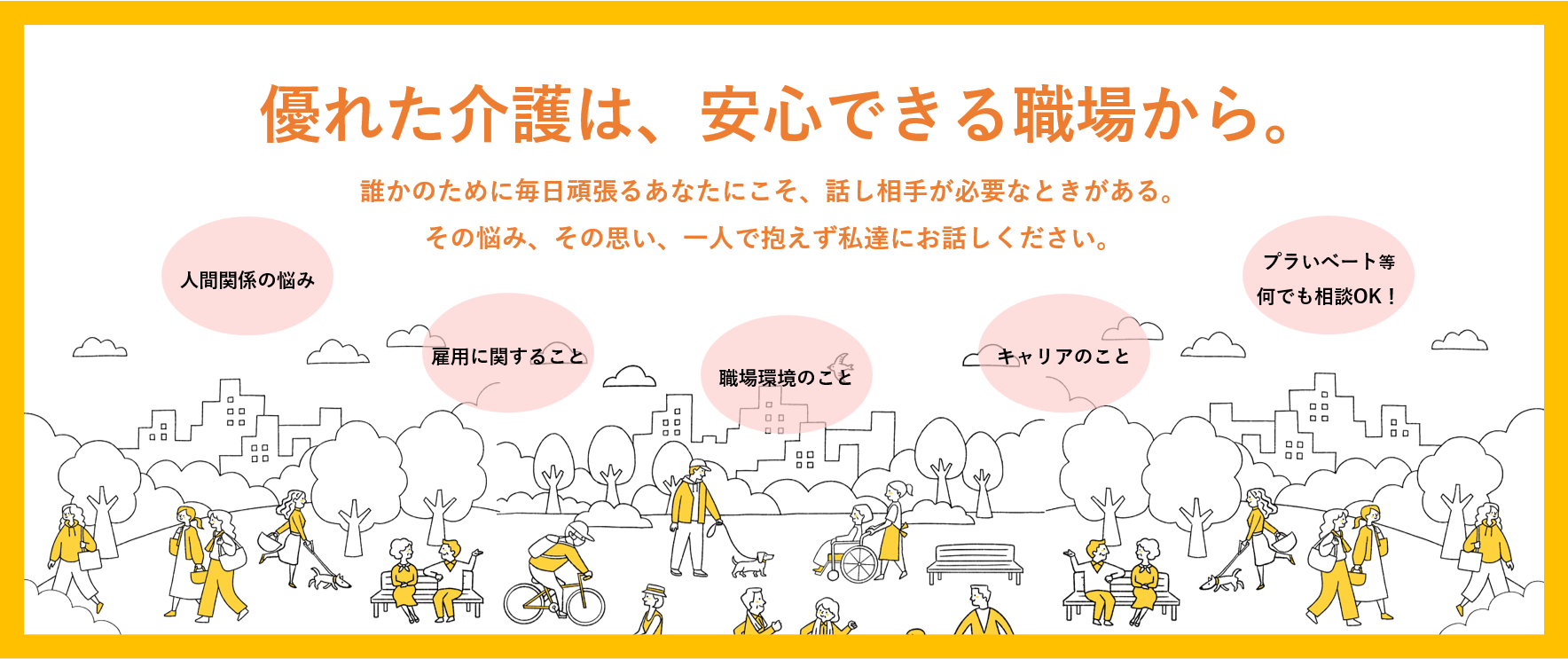 「ケアワーカーの相談室」は、現場従業員と共通体験・共通言語を持つ業界経験者が、多忙な管理職に代わって日々の悩みごとを傾聴し、従業員をはじめとする事業所全体の安心づくりに取り組みます。