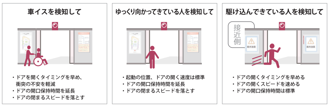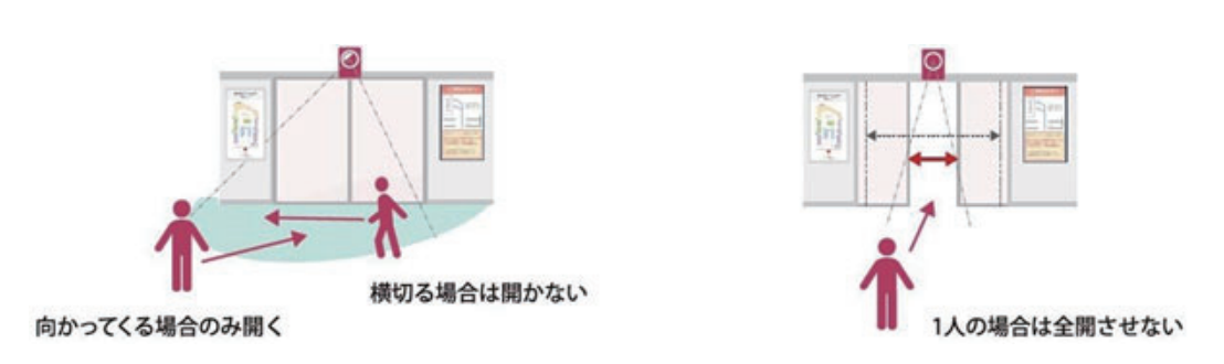 たとえば、ゆっくりとドアに向かっている場合は、開口保持時間を延長します。反対にドアに駆け込んでくる場合には、開くタイミングを早めてドアとの接触を防ぎます。
