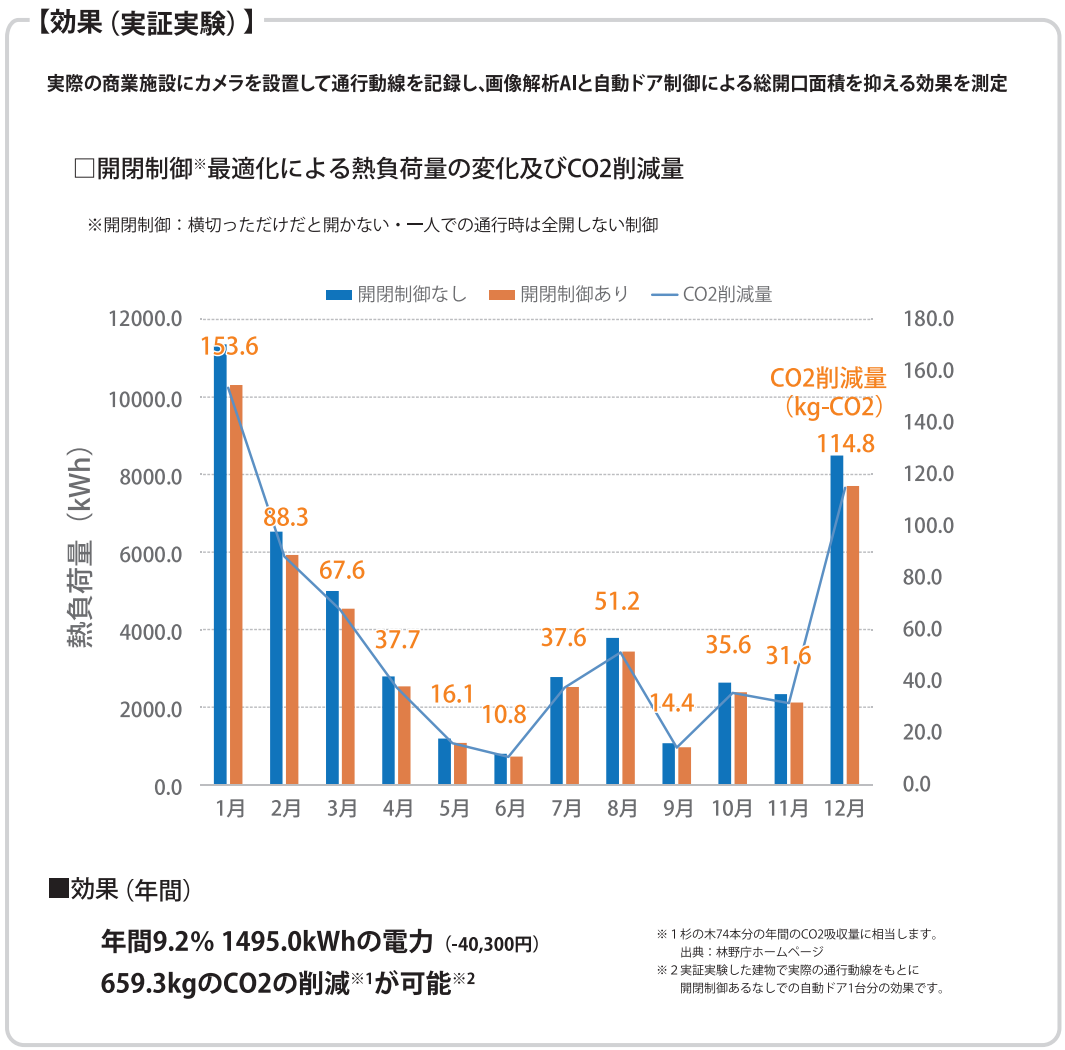 実際の商業施設にカメラを設置して通行導線を記録し、AIによる画像解析と自動ドア制御で総開口面積を抑える 効果を測定しました。 その結果、自動ドア1台分で、建物内の空調にかかる電力を年間で9.2%(1,495.0kWh)削減し、659.3kgのCO2を削減できることが実証されました。これは金額にして年間40,300円の節電であり、杉の木74本分のCO2吸収量と同等の効果です。