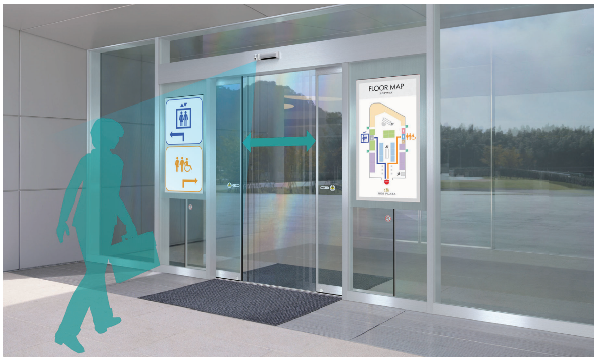 当社は「eメディアドア」で自動ドアの無駄開き削減、開口幅の適切化で空調ロスを低減し、カーボンネットゼロに貢献してまいります。 今後は、AIによる利用者を見分ける技術や物体認識精度を一層向上させ、利用者それぞれに配慮したさらに安全な自動ドアを目指します。また、自動ドア設置場所の価値を活かした情報の受発信なども追求してまいります。