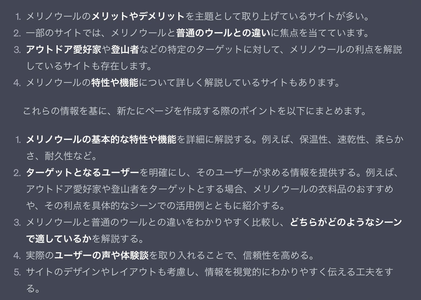 下の画像のように、オウンドメディアやコンテンツマーケティングに必要な情報を、生成AIで得られるようになります。