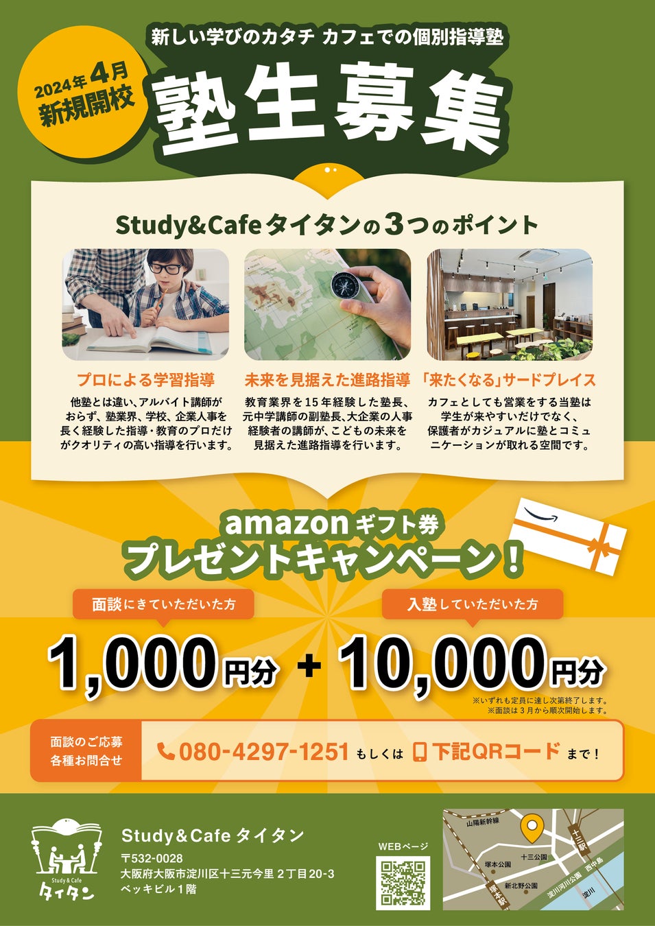 大阪・十三に今までに無い個別指導塾が開校!新規塾生募集としてamazonギフト券がもらえるキャンペーンを実施中!