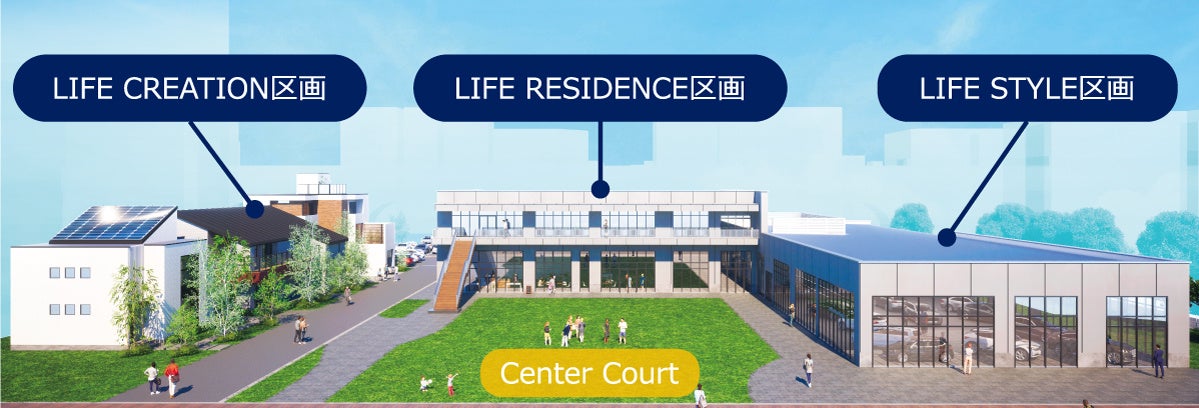 「LIVINGTOWN みなとみらい」は、「LIFE CREATION区画」、「LIFE STYLE区画」、「LIFE RESIDENCE区画」の3つの異なるテーマの区画と、人々が集う芝生公園エリア「Center Court」で構成されています。
