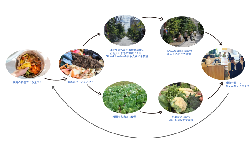 このコミュニティでつくられた堆肥は、商店街の植物の世話にも活用していく予定です。Street Gardenが ”みんなの庭” となって、地域活動に興味がある人、幅広い世代の人が商店街に集うことを期待します。