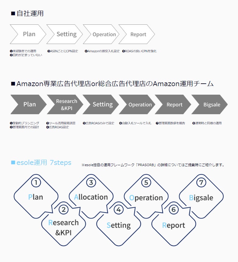 Amazonの広告運用はほぼ広告経由売上の改善を視点においている運用になっており、ブランド成長に好影響を与えているとは言えないです。esoleでは大手総合代理店でAEとしてカテゴリーNo.1ブランドを支援していた経験を活かし、ブランドコミュニケーションプランに沿った運用で、ブランド成長を目的とした継続的なAmazon売上成長に視点をおき、Amazon広告運用を支援していきます。