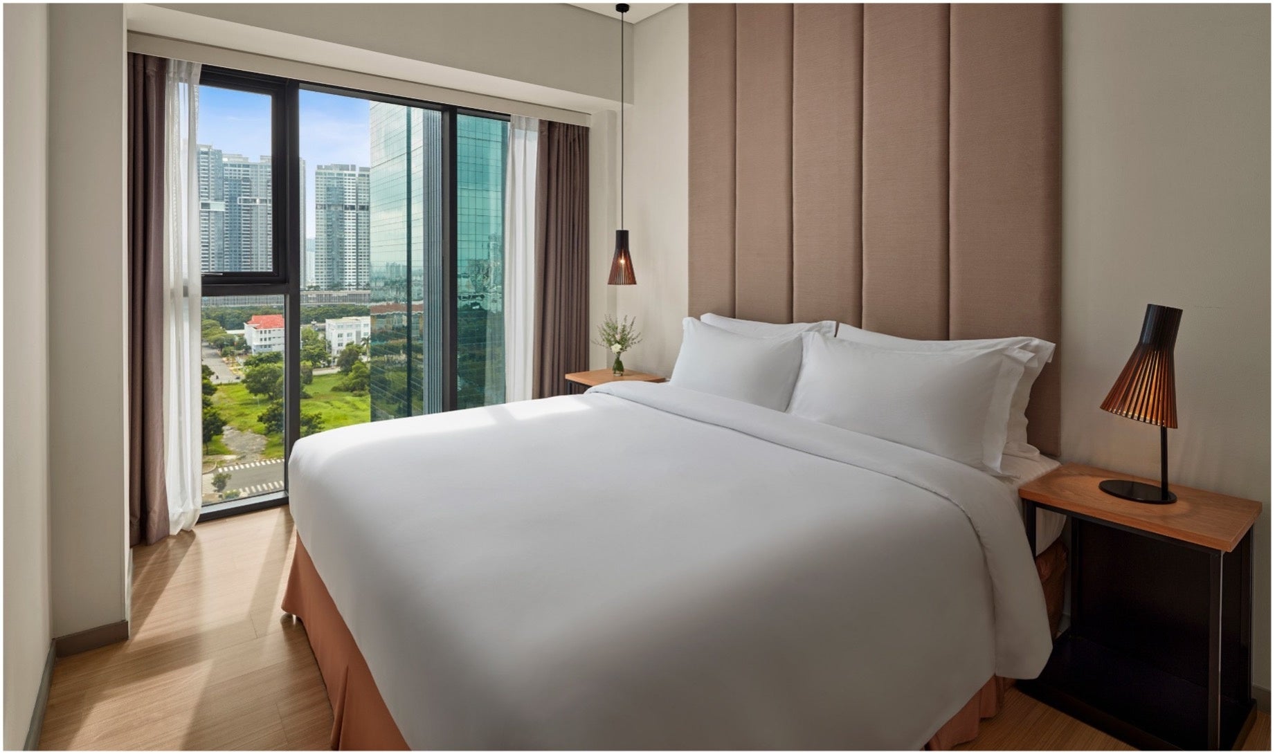 サイゴンエキシビション&コンベンションセンター(SECC)から徒歩わずか2分、ショッピングモール、レストラン、インターナショナルスクール、病院に囲まれ、市内中心部から車でわずか20分という絶好のロケーションに位置するこの活気あふれるレジデンスは、このダイナミックな商業の中心地に短期または長期滞在する法人旅行者やご家族連れに理想的です。