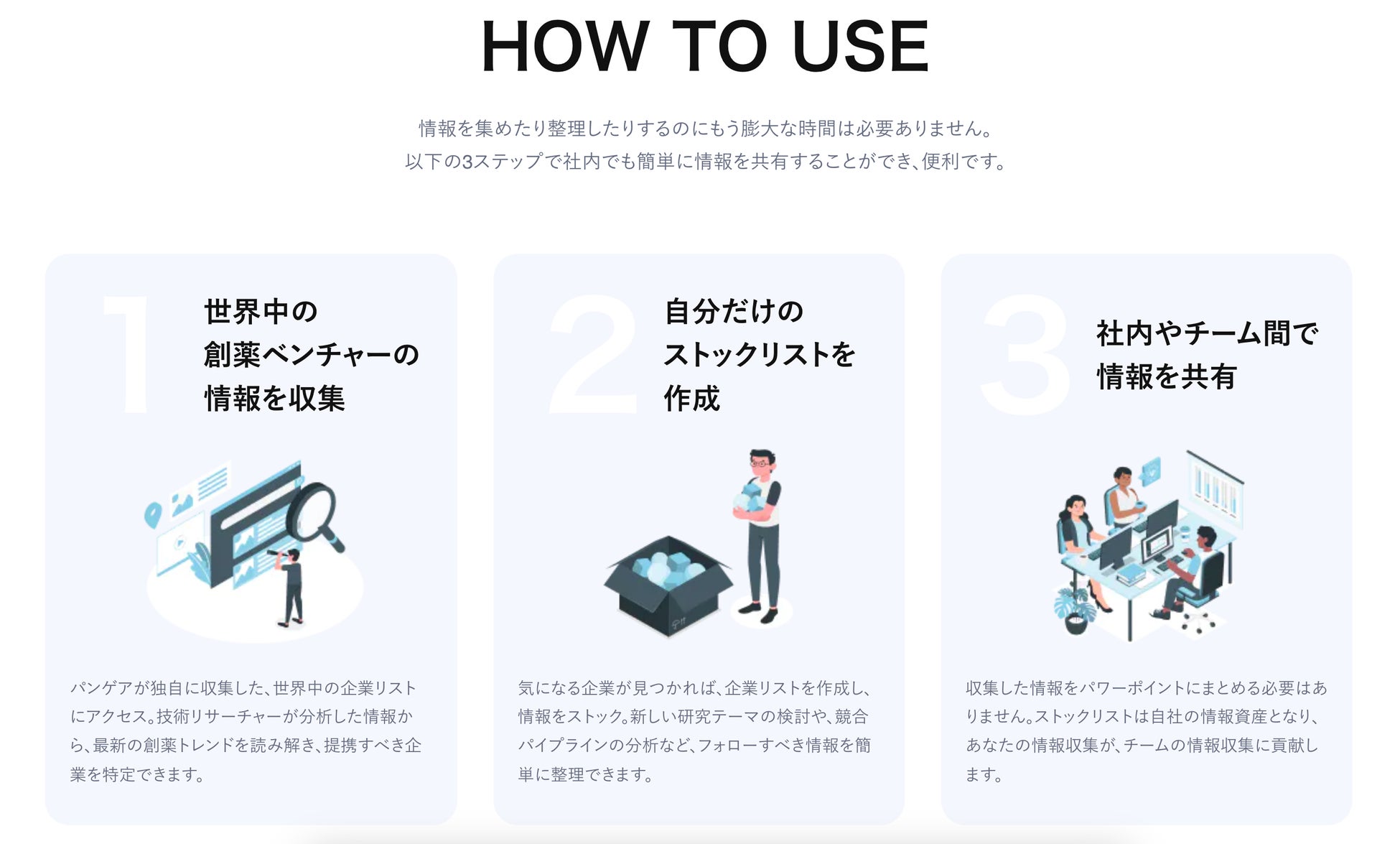 また、ストックリスト機能によって任意の企業をリスト化し、特定の研究テーマや技術分野でフォローすべき企業を一覧で管理でき、個人の情報収集の管理、およびチーム内でのナレッジシェアが可能になります。加えて、パンゲアが特定のテーマの注目企業を取りまとめ、公式ストックリストとして定期的にユーザーの皆様に配信することで、最新の技術トレンドや、 研究動向の把握にご活用頂いております。