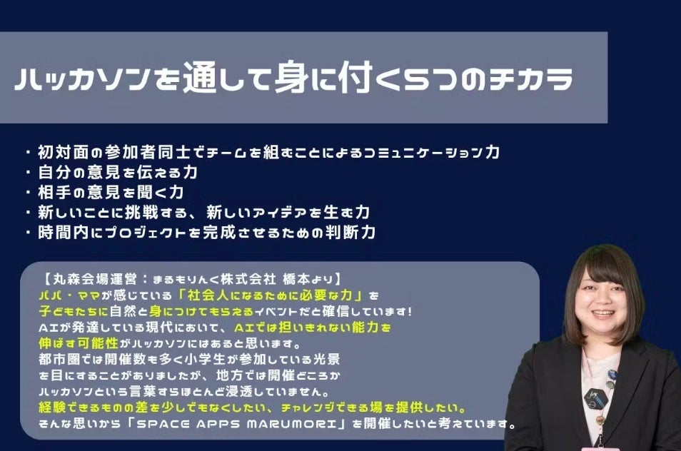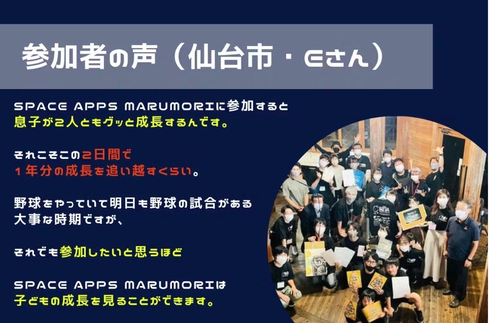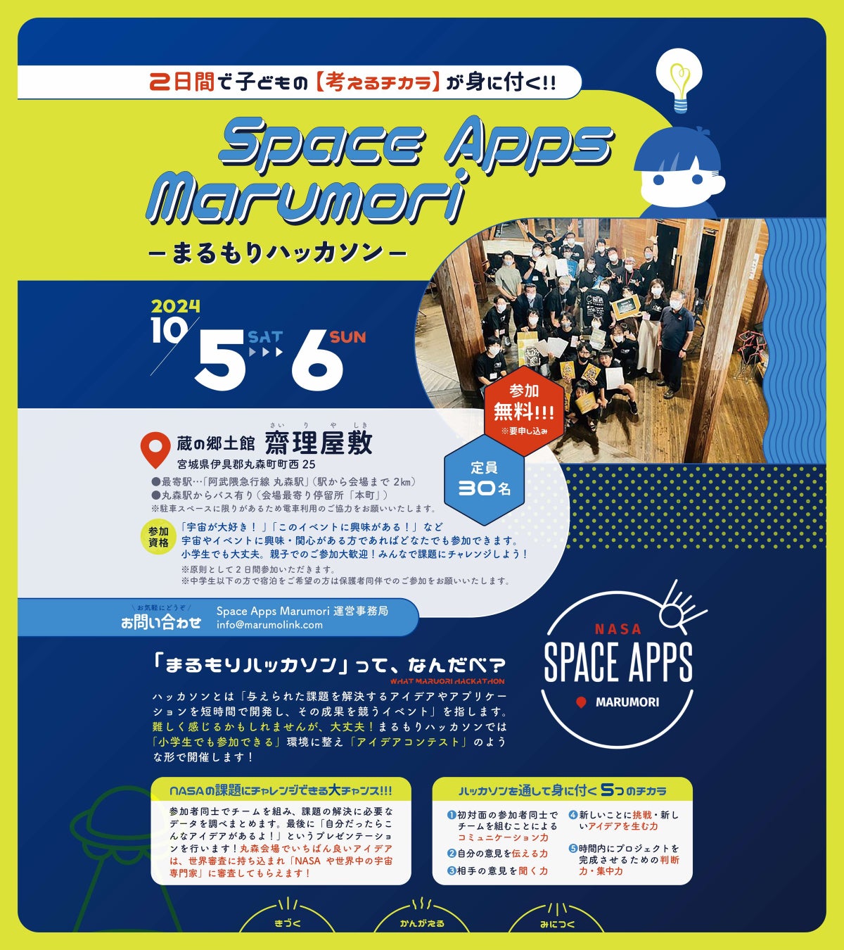 2024年10月5日(土)・6日(日)に「Space Apps Marumori」を開催!本会場では、小学生でも参加できる形に刷新し、宇宙に関する課題に挑戦し、未来を歩む力を育む取り組みです。
