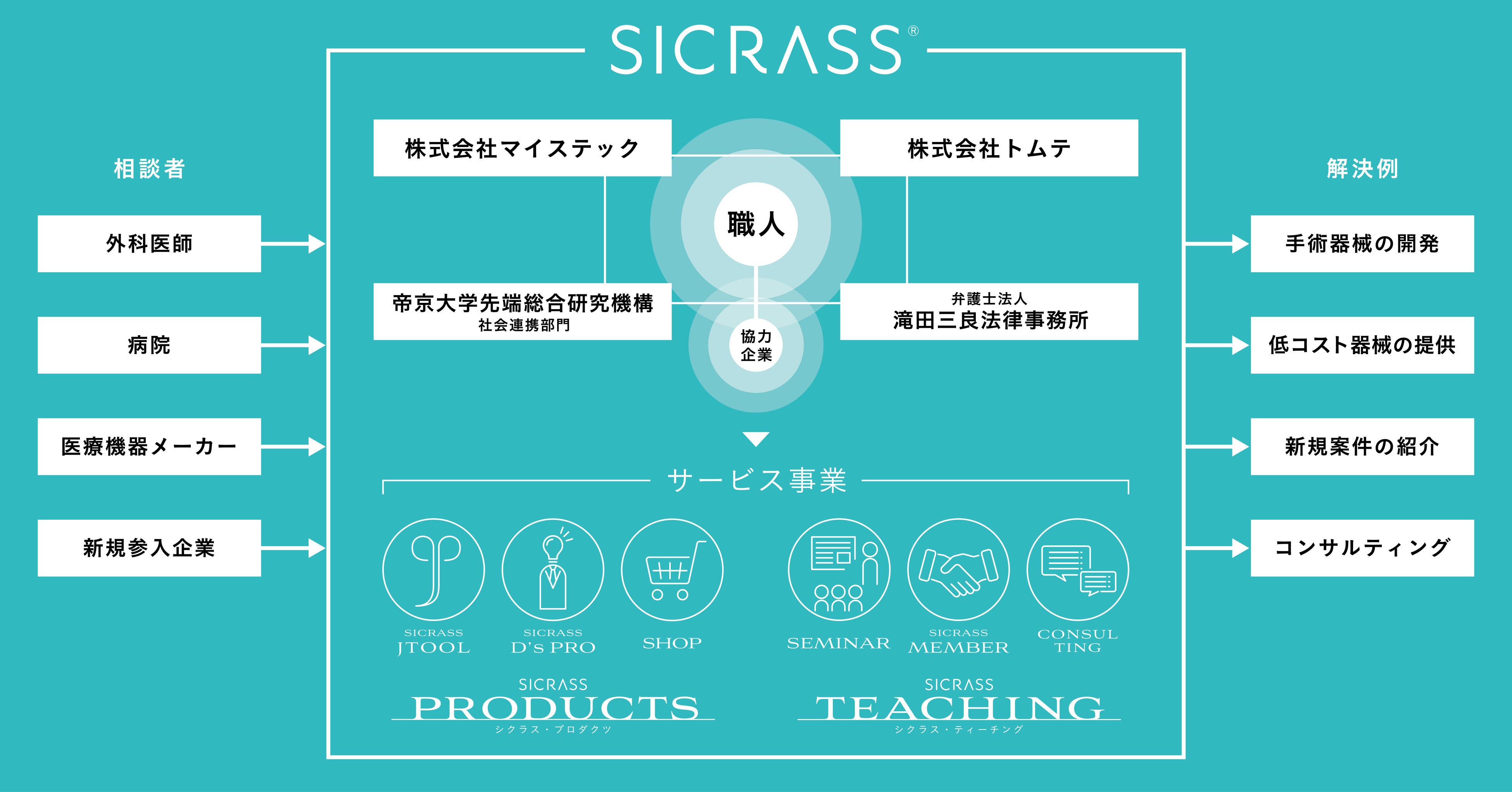 そこで、株式会社マイステックは、東京都主催による「東京ビジネスデザインアワード」へテーマ企業としてこの課題を提案。株式会社トムテとともに考案した「SICRASS」がテーマ賞を受賞し、本サービスが事業として開始されました。SICRASSはこの事業の主旨に共感いただいた大学や弁護士事務所、医療器械に関わるさまざまな加工メーカー、専門家も参画した一大チームとなって、医療業界のみなさまの課題解決に取り組んでいきます。
