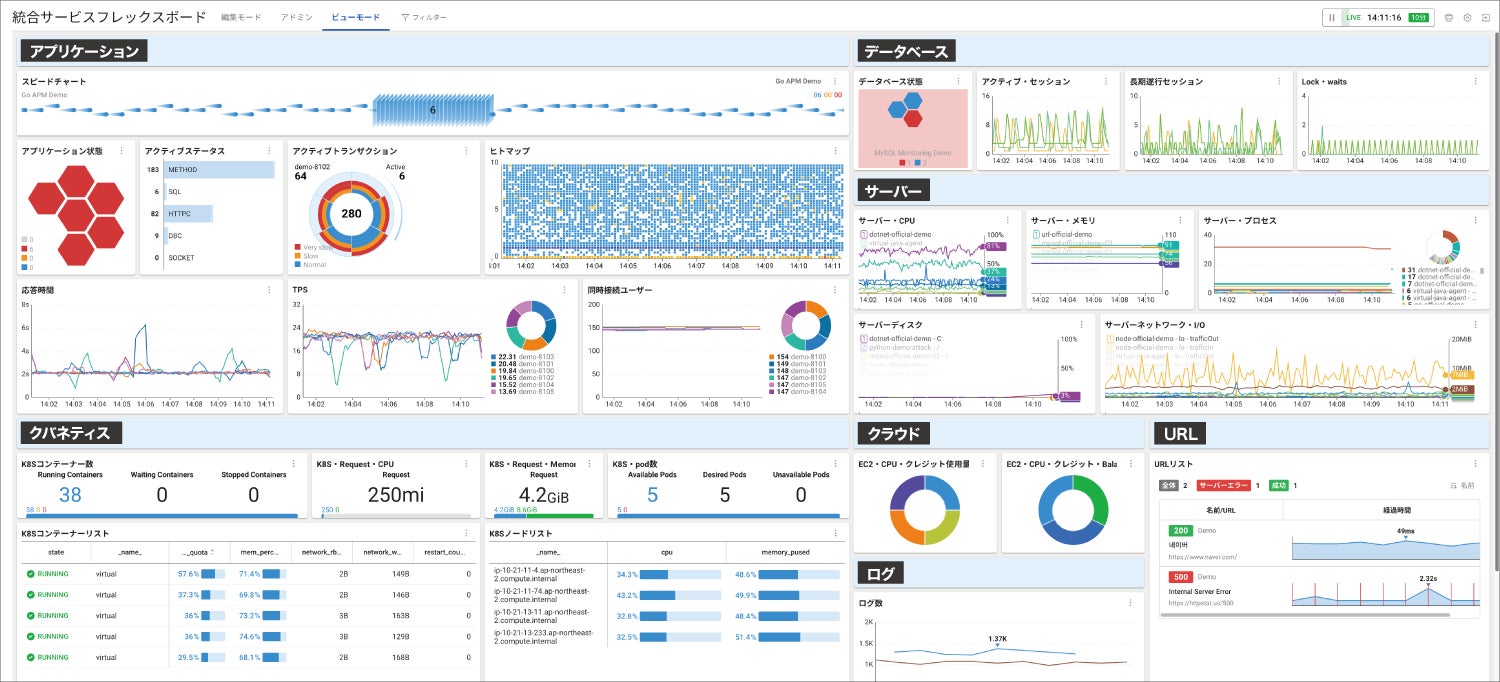 アプリケーションやデータベース、クバネティスなどの稼働状況を1画面で確認できる、統合サービスフレックスボード。表示する項目はユーザー独自にカスタマイズできます。