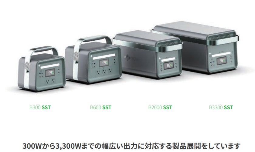 今回リリースする製品(固体電池ポータブル電源)はB300 SST、B600 SST、B2000 SST、B3300 SSTの4種類。商品型番にある数字は定格出力を示し、300Wから3300Wまでの電子機器が利用可能。
