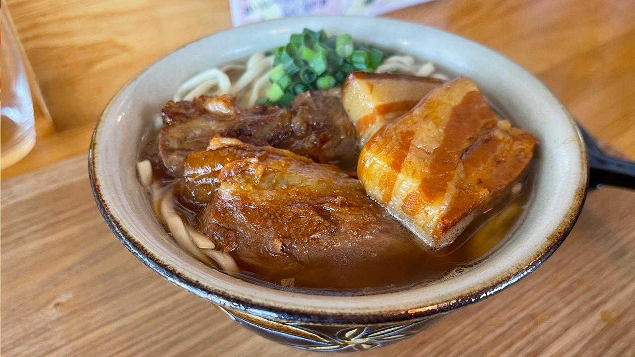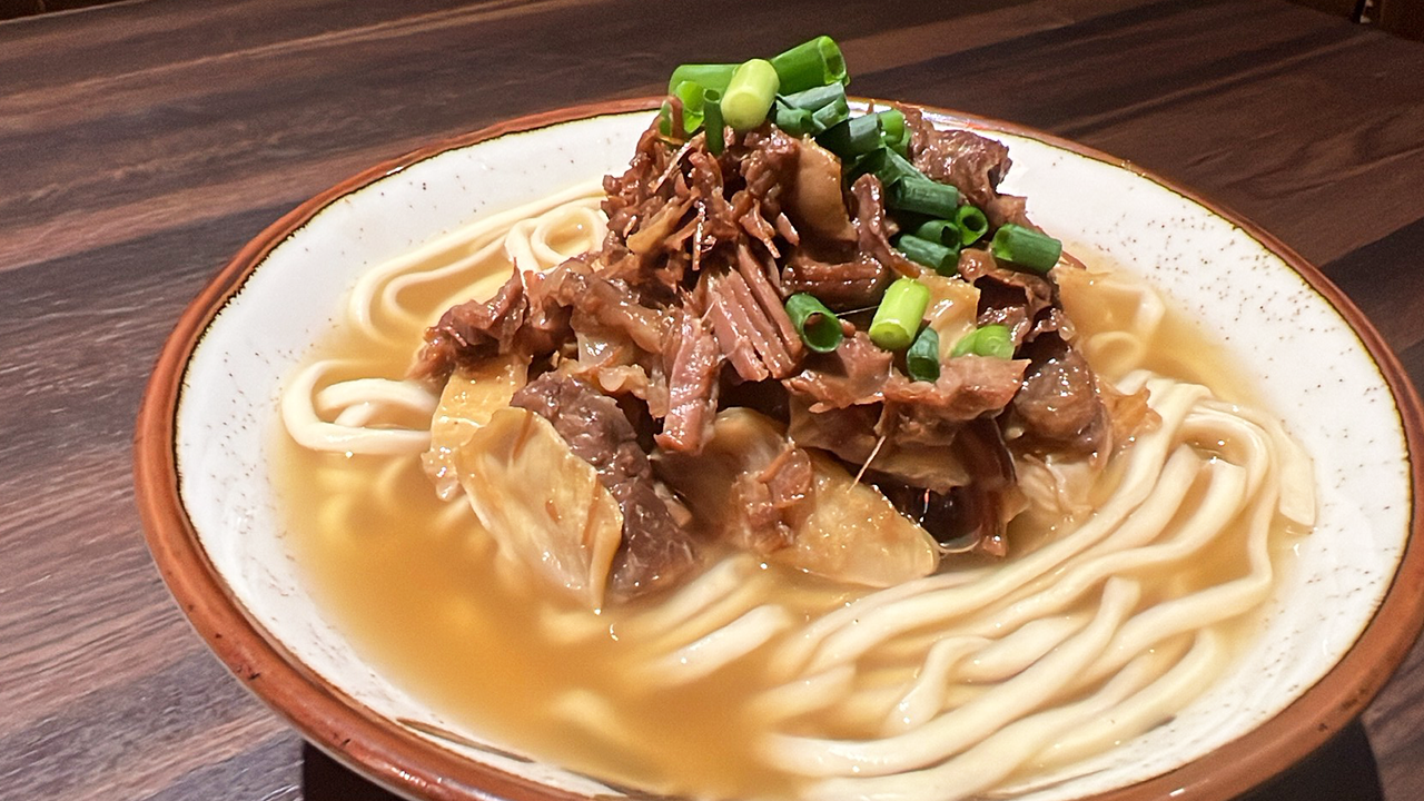 優しい味わいのそばに、甘辛い牛肉がたっぷり乗った宮古島の新名物グルメ。沖縄県産の黒糖と数種類の調味料をブレンドした独自のタレでお肉を長時間煮込み、あと引く美味しさに仕上げました。