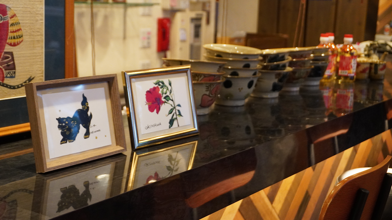 心地良い三線の音色に導かれて店内に入ると、壁一面に飾られた華やかな琉球紅型や沖縄の自然溢れる絵画がお出迎え。カウンターやテーブル席のほか、自然を基調としたテラス席もご用意しております。