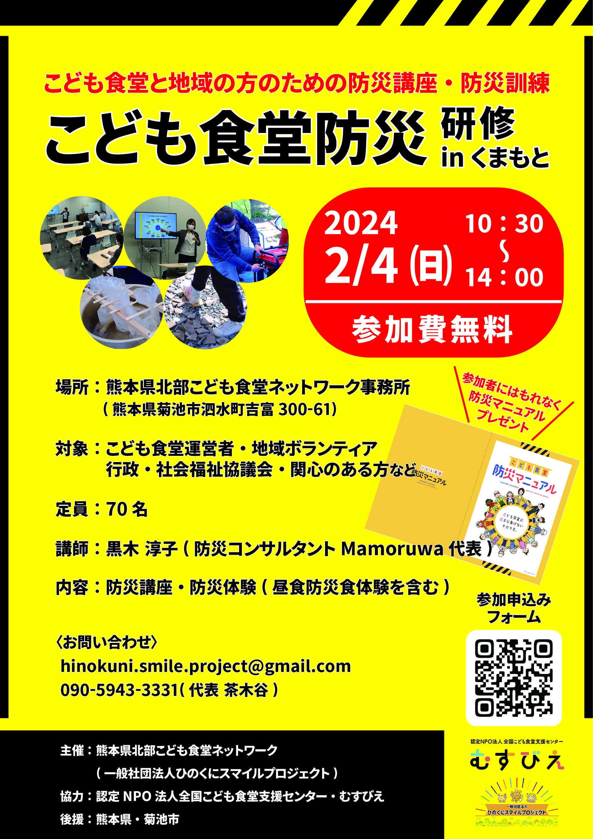 熊本県北部こども食堂ネットワーク(一般社団法人ひのくにスマイルプロジェクト)は、こども食堂+防災として、認定NPO法人全国こども食堂支援センターむすびえと協力し防災研修を実施します。