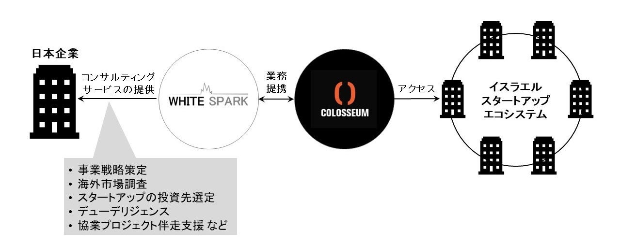 White SparkはColosseumとの提携を通じ、スポーツ領域での事業創出・拡大を目指す日本の企業に対して、事業戦略策定や海外市場調査、イスラエルスタートアップの投資先選定及びデューデリジェンス、協業プロジェクトの伴走支援などのコンサルティングサービスを提供します。