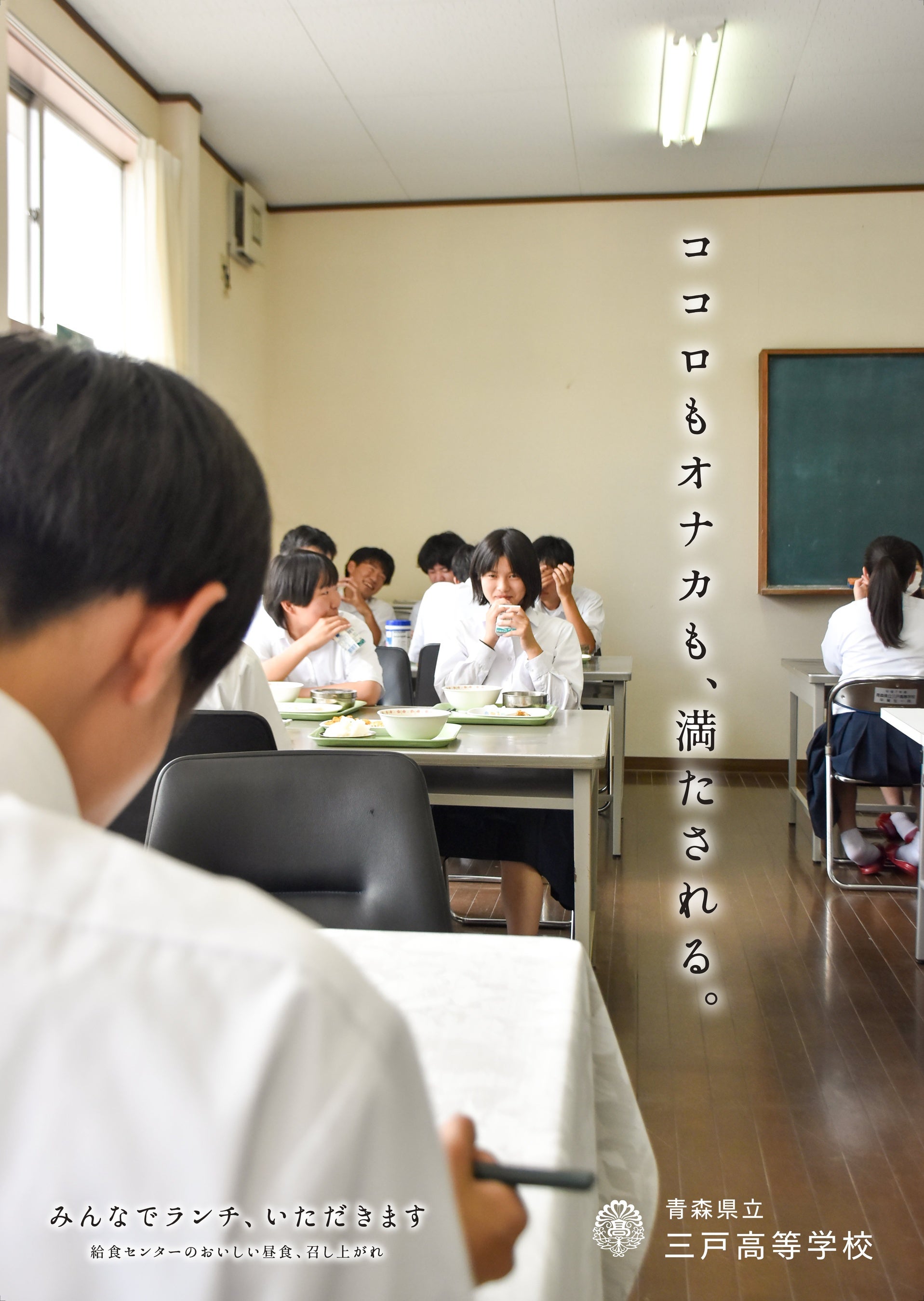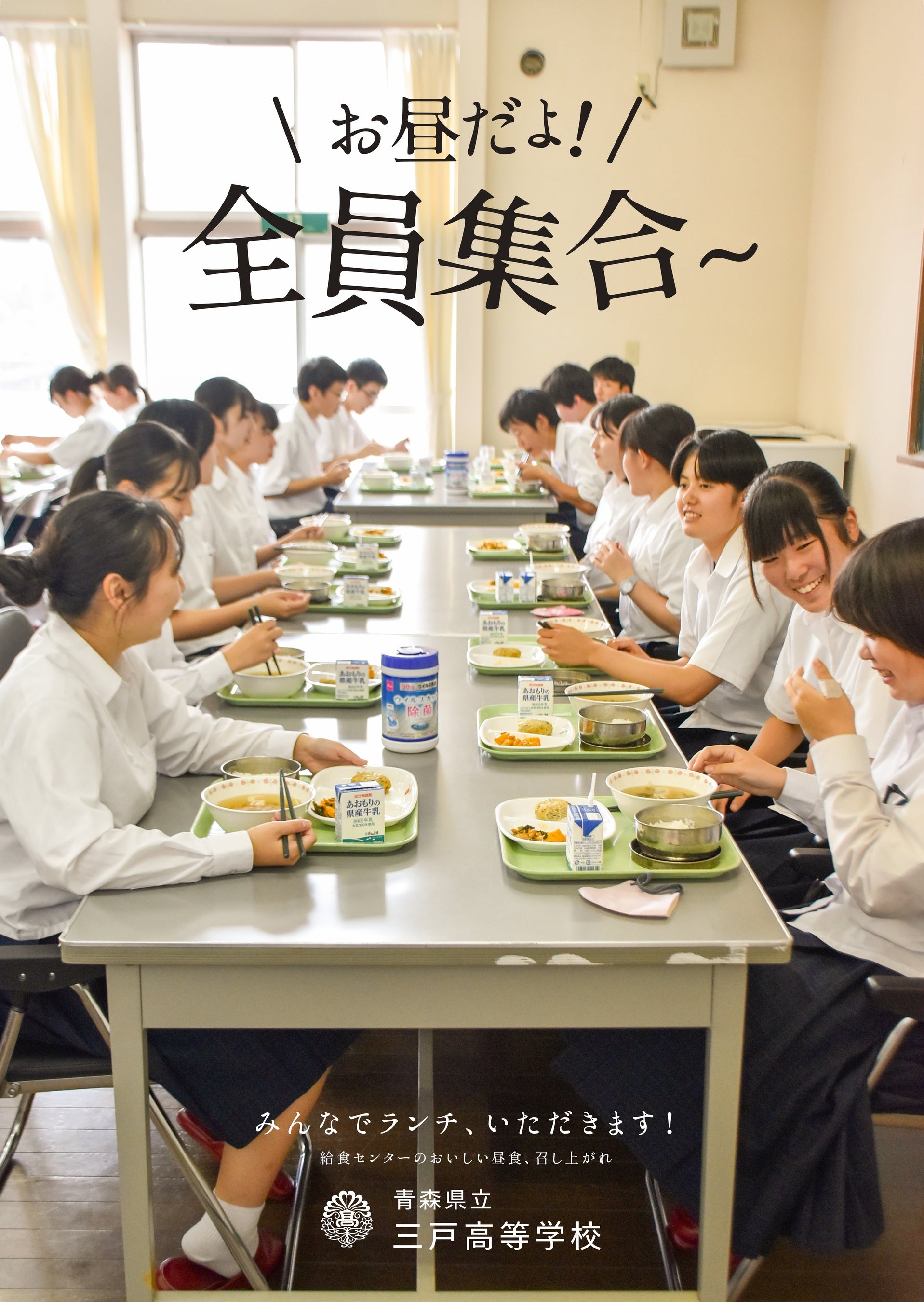 三戸高等学校には、青森県の県立高校では唯一の「昼食提供」という給食センターがつくる昼食を提供する制度があります。ホールでおいしいランチをみんなで一斉に食べます。