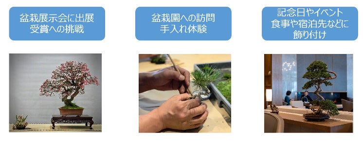 また、所有者が遠方・海外の方でも盆栽園へ見学しやすいよう、解説や手入れ体験ができるアクティビティもご用意しています。食事の際や宿泊先のホテルに飾り付け共に過ごしていただくことも素敵な体験になると思います。