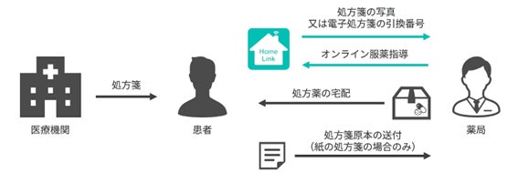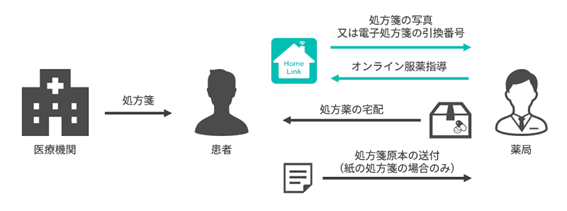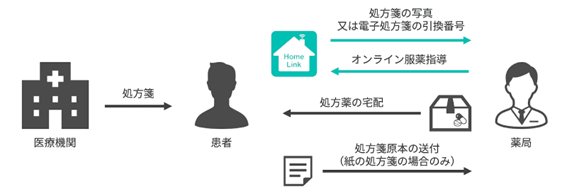利用者は、HomeLinkアプリ上で処方箋の写真(電子処方箋の場合は引換番号)を送信し、オンライン服薬指導を予約することで、薬剤師からビデオ通話で薬の説明を受けることができます。また、アプリ上で電子決済ならびに配達の予約までを行うことができ、薬は患者さんの自宅まで配送されます。