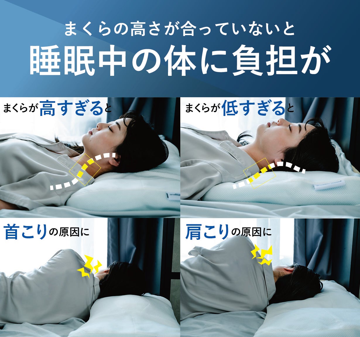 体に合わない枕を長期間利用すると、睡眠中の体に大きな負担がかかってしまします。規格製品は高さや硬さが合っていないケースも多く、日常の睡眠に大きな影響を与えます。