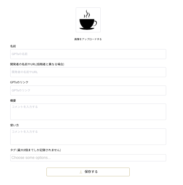 自分が開発したGPTsやサイトに掲載されていないGPTsも、簡単にサイトにアップロードできます。自身のGPTsや未掲載のGPTsを追加する場合、開発者情報や概要・使い方を入力してサイトに掲載できます。