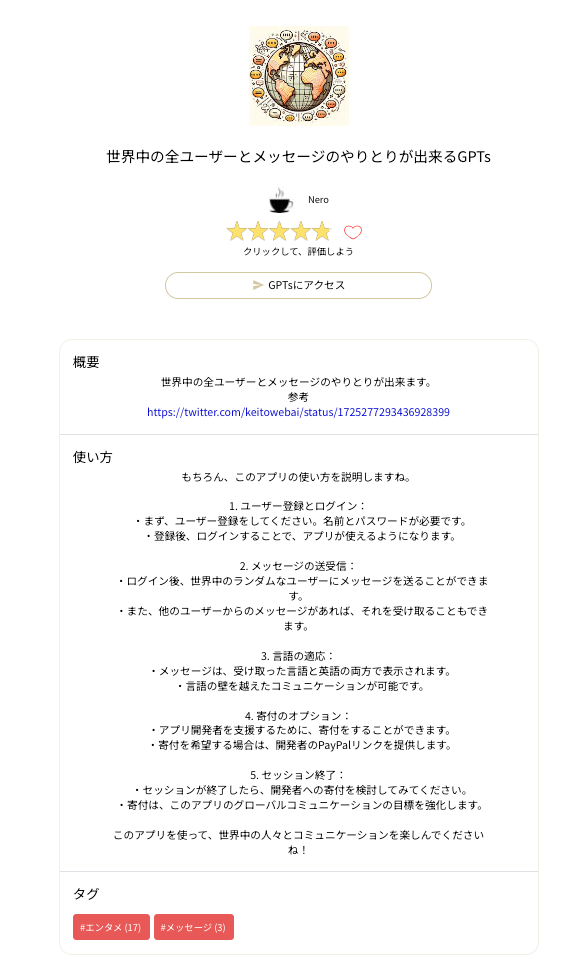 「GPTs coffee」では、各GPTの魅力が詰まった概要と直感的な使い方を掲載しており、ユーザーはワンクリックで世界中のGPTsを体験できます。さらに、ユーザーが直接評価やフィードバックを投稿できるコミュニティー機能もございます。