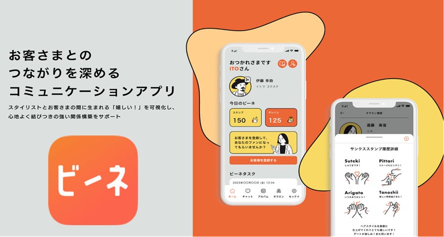 「ビーネ」は、スタイリストとお客さまとのつながりを深めるコミュニケーションアプリサービスで、「人に元気や感謝というエネルギーを届ける」を理念とし、お客さま、スタイリスト、サロン経営者の抱える課題の解決を目指しています。