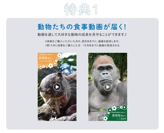『Hello!OHANA』では、全国の動物園、水族館からお気に入りの動物を選び、「食事」をプレゼントすることができます。プレゼントできる「食事」は、果物に野菜、魚といった、選んだ動物が食べることのできる食材が、各生産者さま、漁港から各動物園、水族館へ送られます。これらは、おいしいのに見た目だけで”規格外”となり、市場で売りにくくなってしまった農産品を活用することで、フードロス予防にも繋がっています。「食事」をプレゼントしたユーザーにはプレゼントの金額や継続日数に応じて、動物たちからのお礼として、プレゼントされた食事を楽しむ動物の動画やグッズといった特典を受け取ることができます。これまで動物園、水族館で見るだけだった動物たちに、離れたところからでも成長をサポートすることができるサービスとして、動物たちへの新たな「推し活」を楽しんでいただけます。