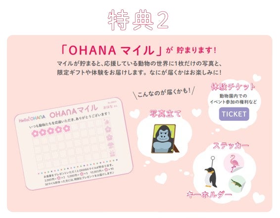 プレゼントの金額や継続日数によって、「OHANAマイル」が貯まります。貯まったマイルに応じて、推しの動物の写真やLINEスタンプ等のオリジナルギフトをお受け取りいただけます。