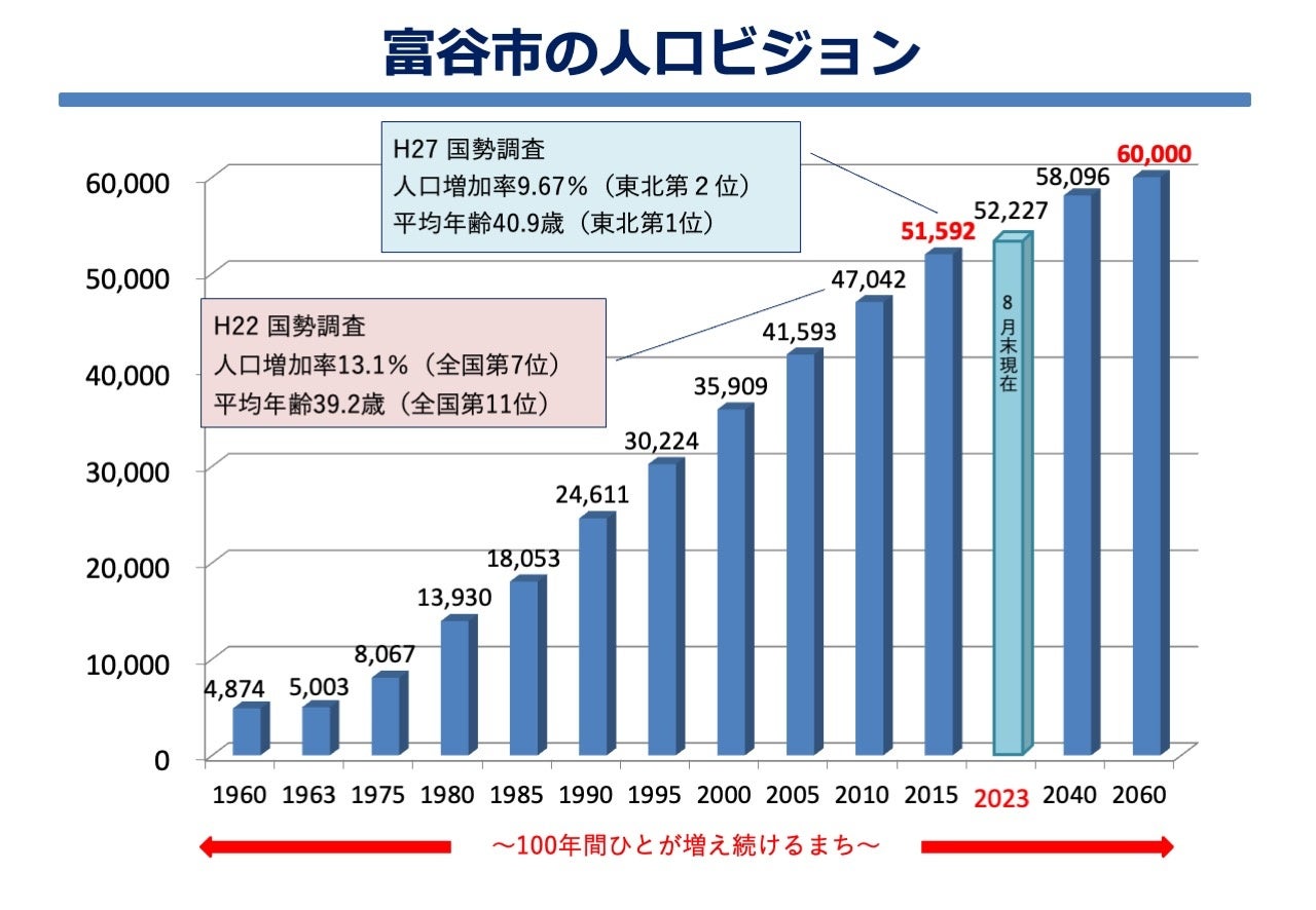 1960年の町制施行時から市制施行時まで人口が増え続けており、現在の人口は52,227人、世帯数は20,292世帯(8月末現在)で、平均年齢が若く子育て世代が多いという特徴があります。まちづくり将来像を「住みたくなるまち日本一」と掲げており、富谷町発足から100年となる2060年まで、人口が増え続けるまちづくりに取り組んでいます。