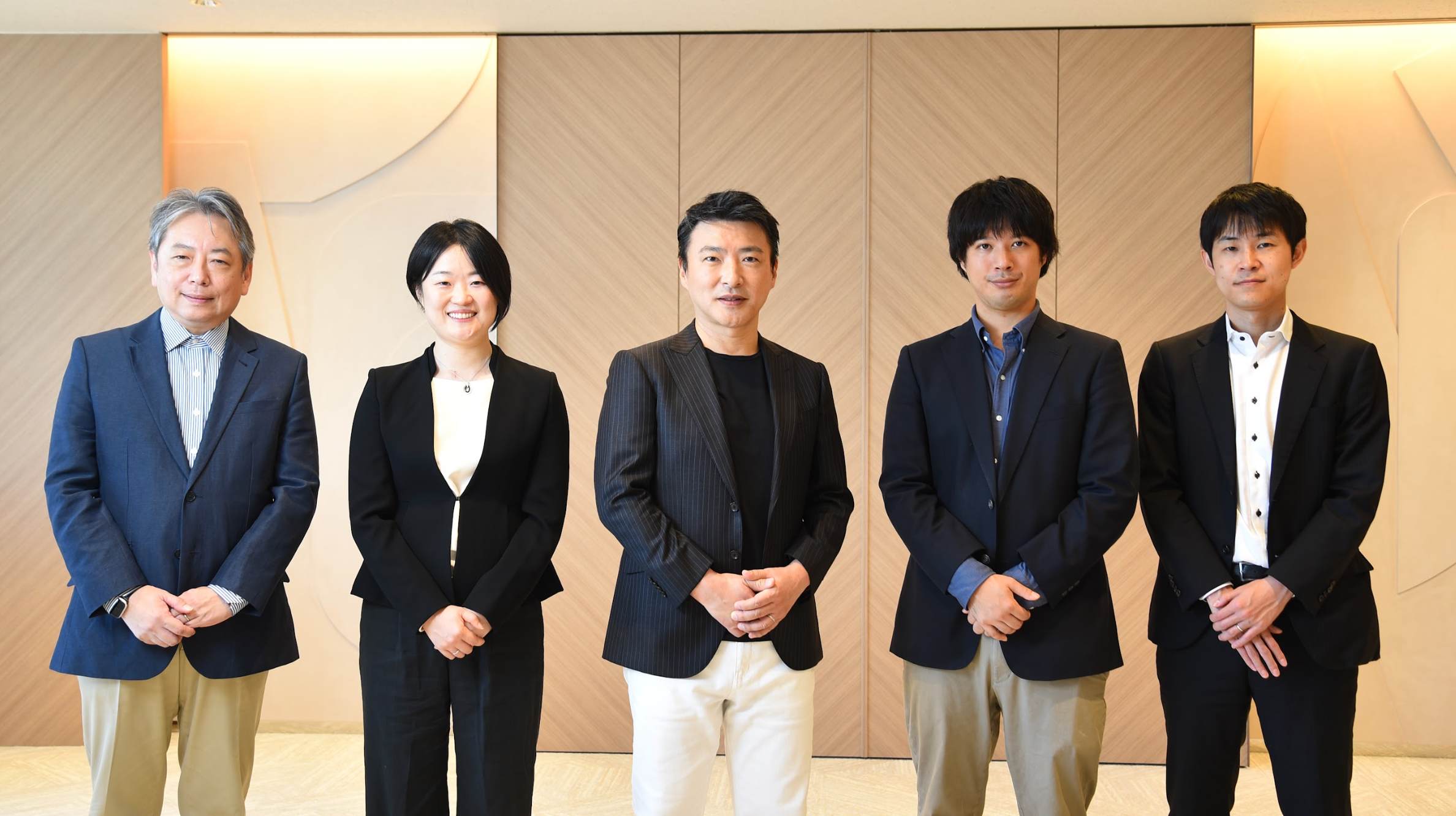 中央:和田千弘(代表取締役社長グループCEO)。中央から右へ:井上圭(取締役グループCMO)、宮原拓郎(監査役)。中央から左へ:ムン・ウルジョン(執行役員 リブゲートCTrO)、及川直彦(シニアアドバイザー)。