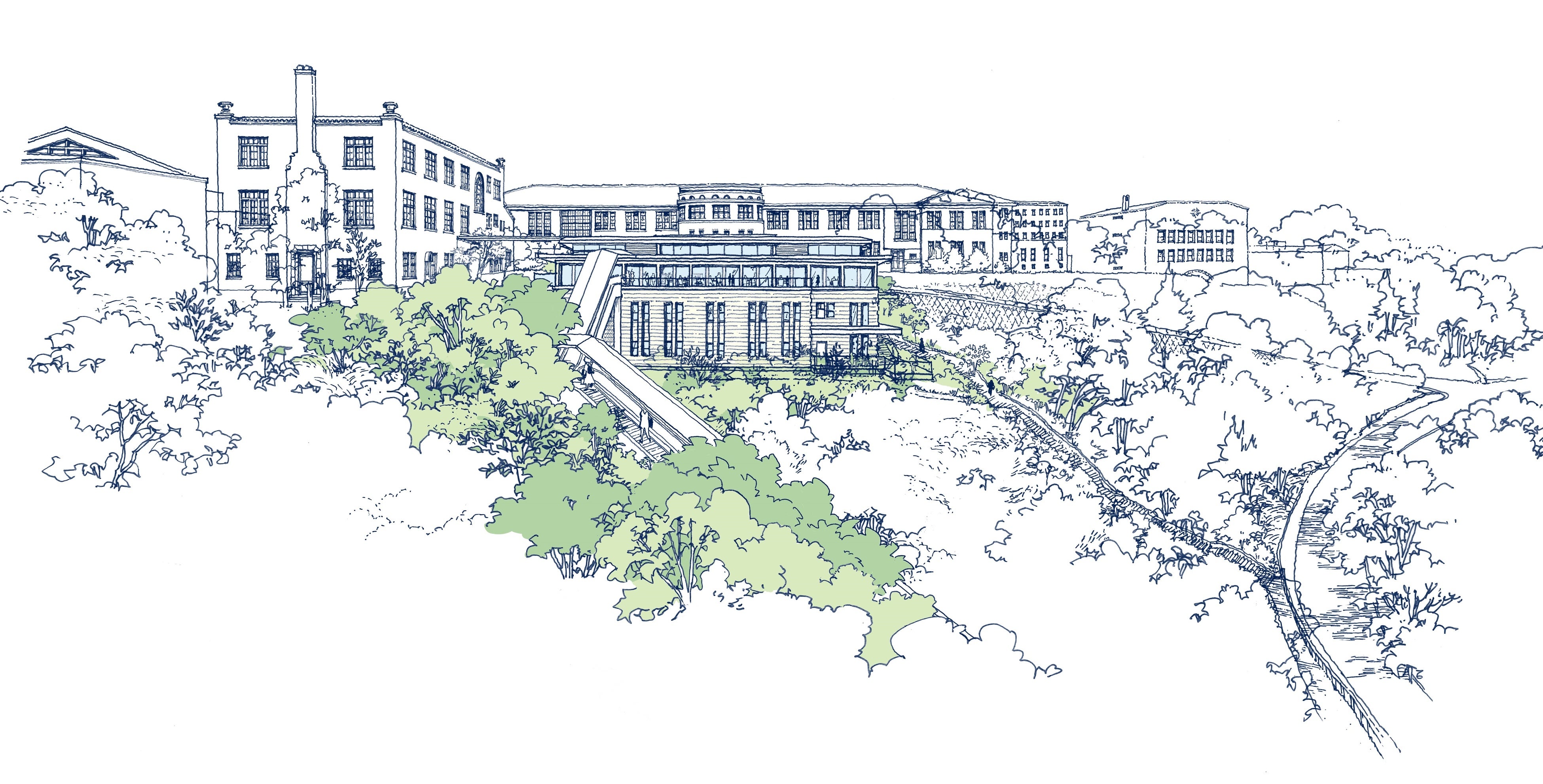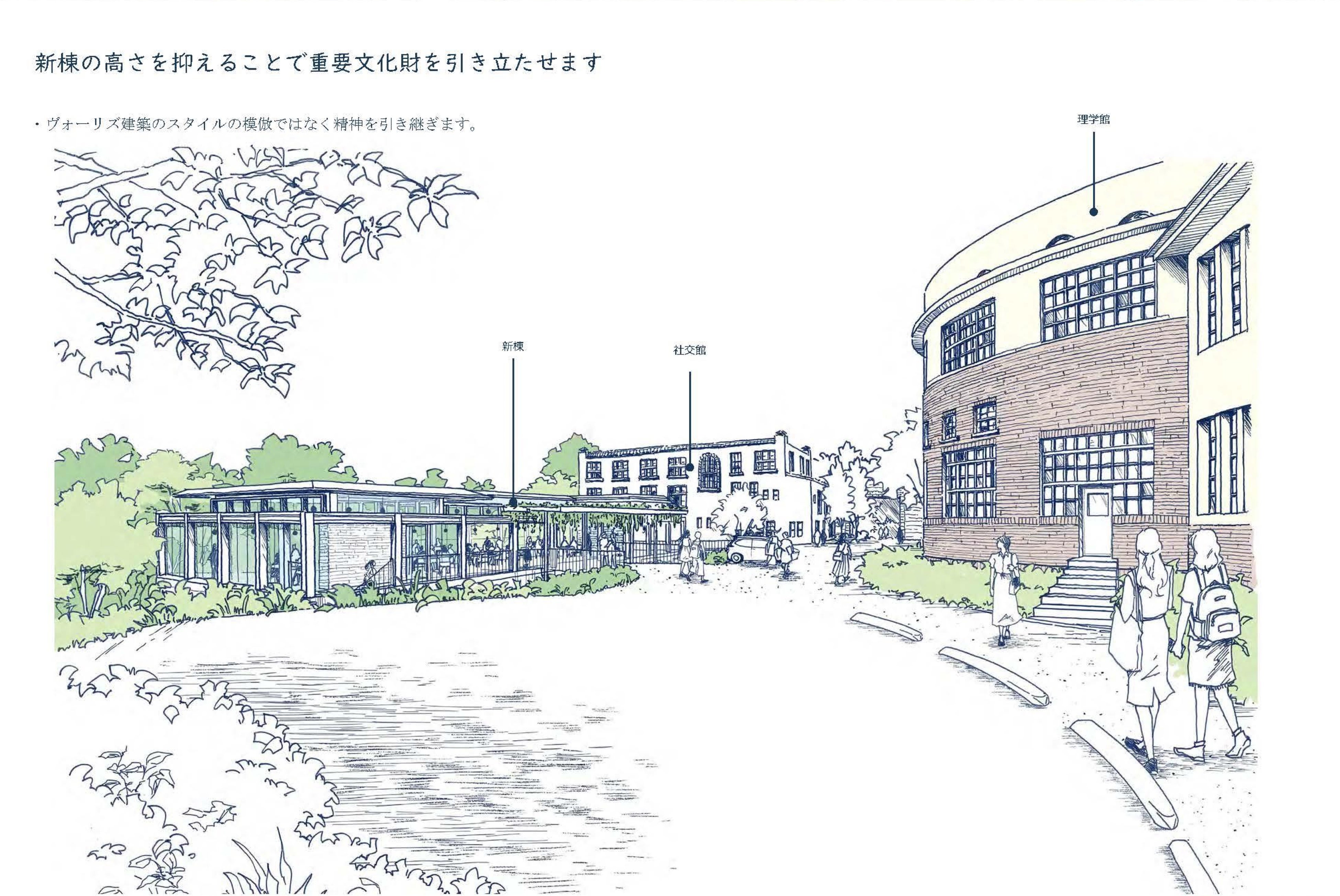 ヴォーリズの精神を承継しつつも模倣はしないことが設計のコンセプト。ヴォーリズの基本的アイデアである中庭、建物間の軸線を合わせること、回廊で建物を繋ぐこと、を活かし、地上部分にラウンジを設けてこれまで裏側であった理学館西側地域を新たなエントランスとします。ラウンジは豊かな緑に臨み、周りに巡らした回廊は、人々の出会いの場となります。そして、低く抑えた建物は重要文化財の理学館と社交館を引き立て、一方で、理学館はラウンジと同一軸線上にあるため、その借景として活かされます。